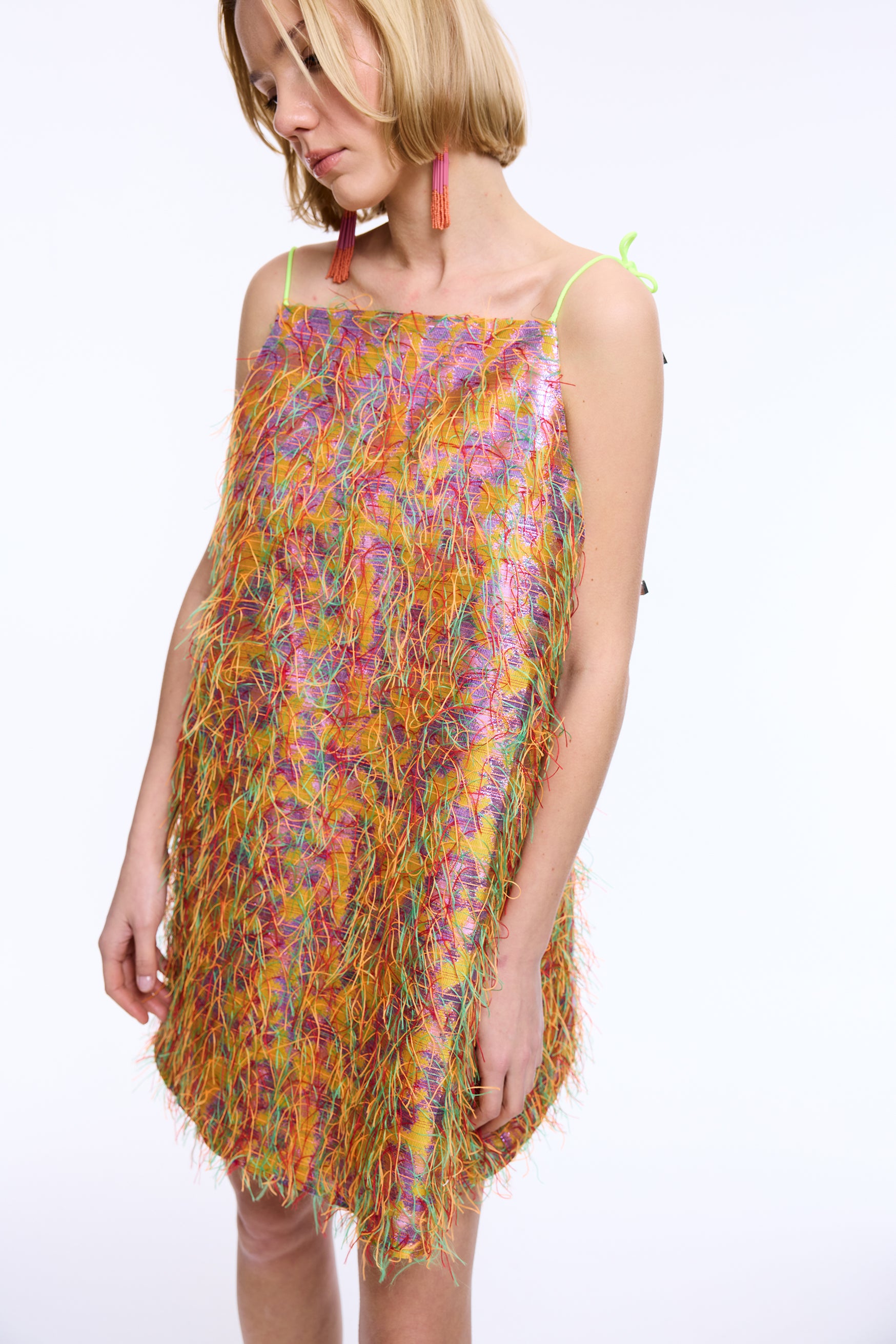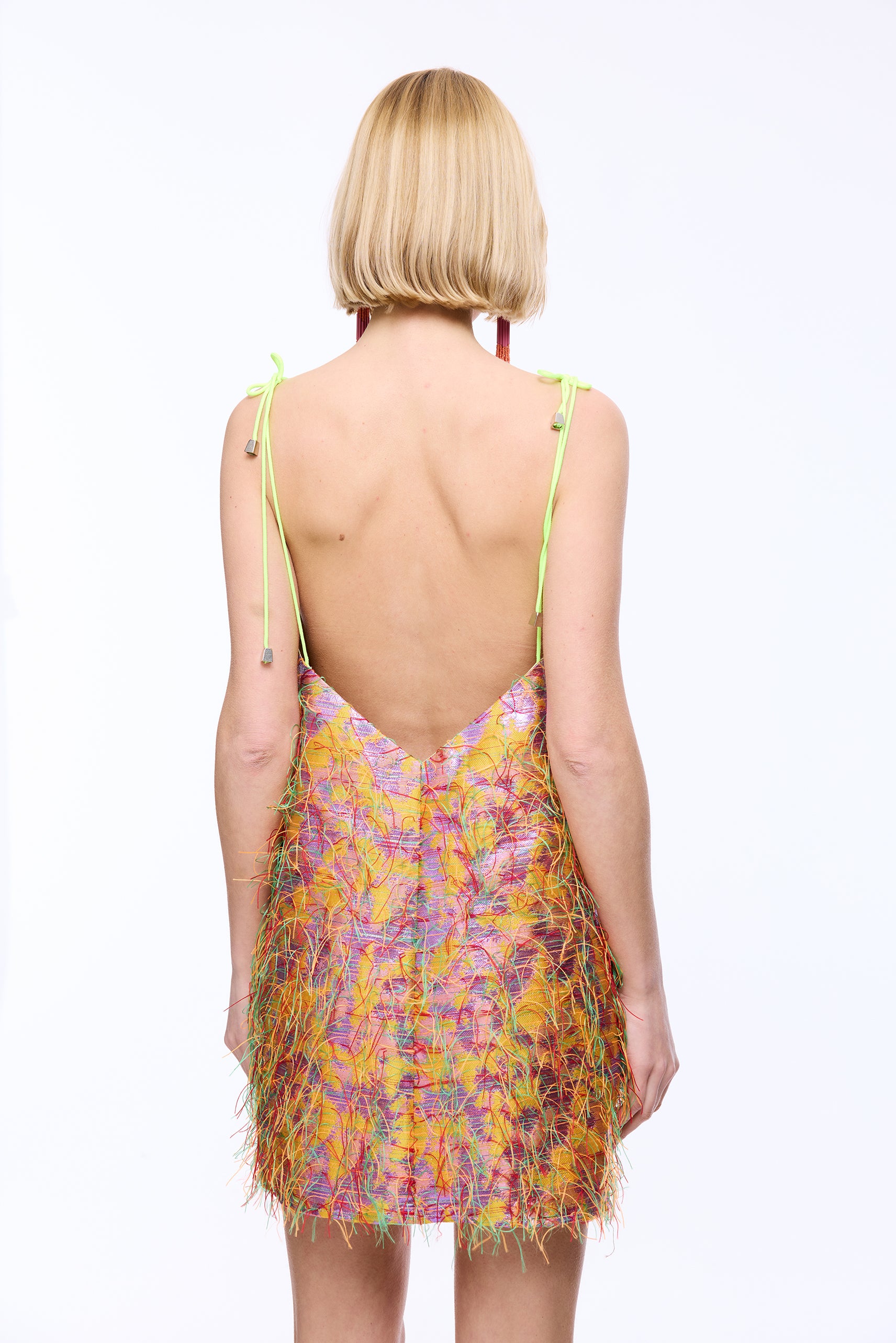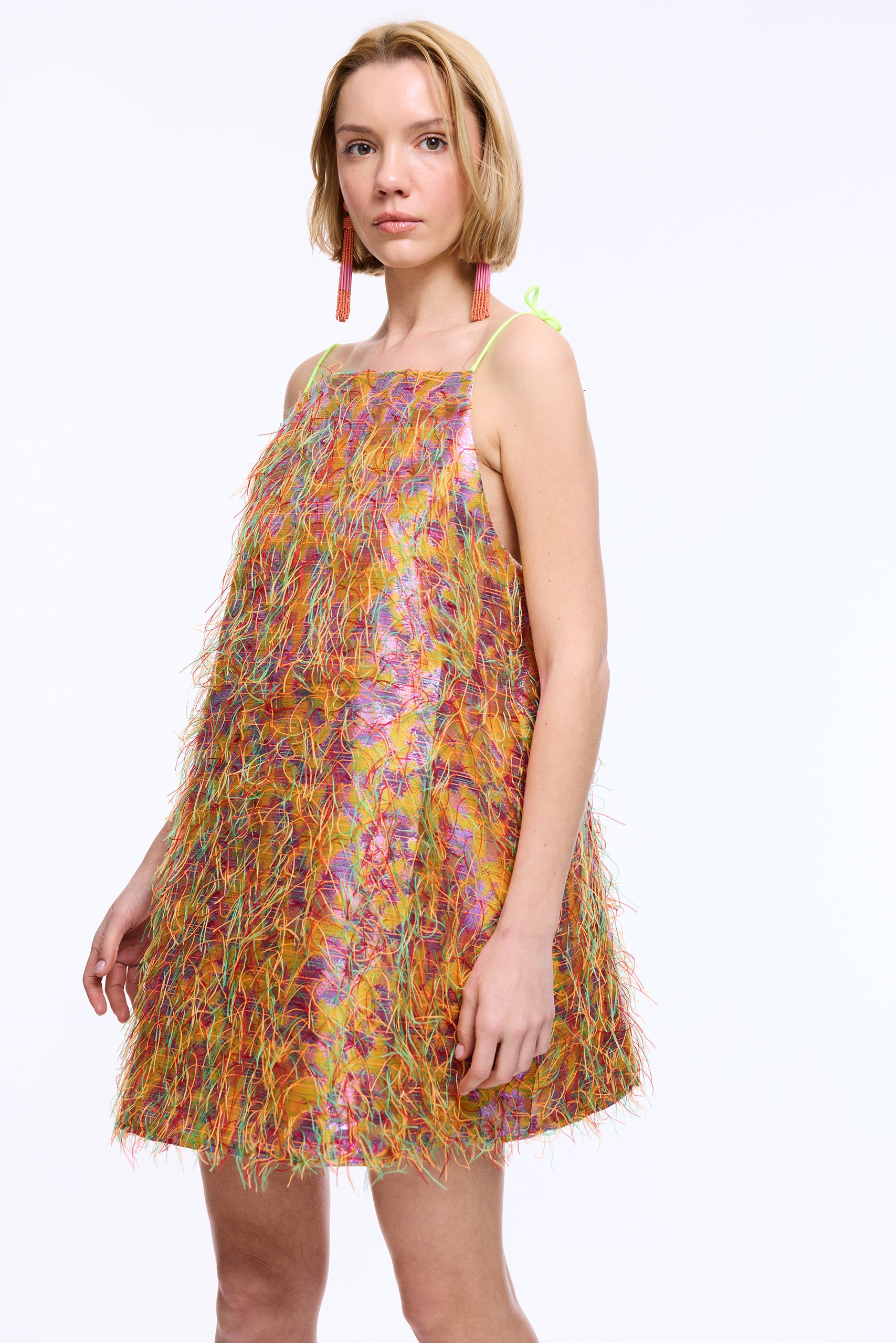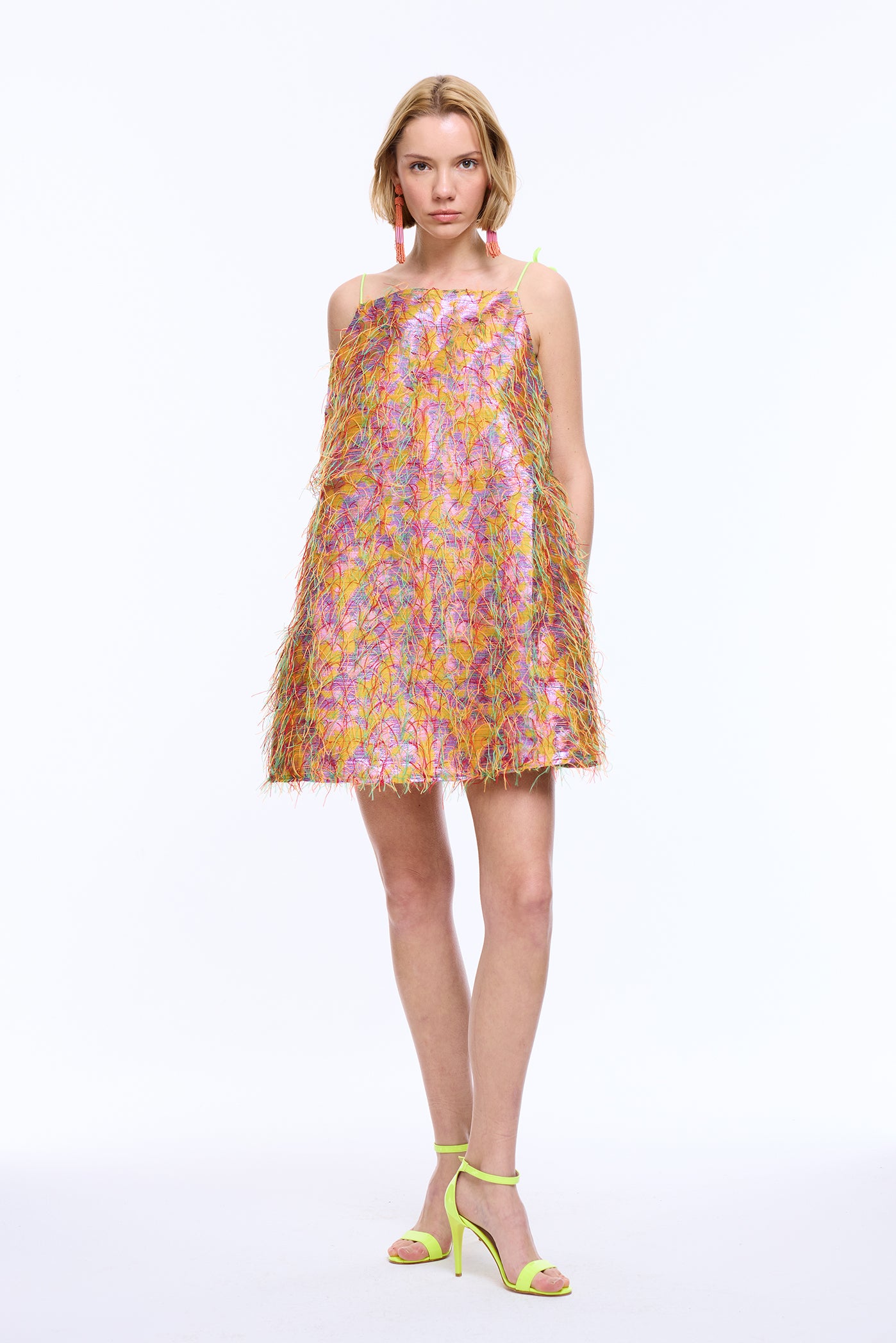 Crafted from unique fringe jacquard fabric, this mini dress is a bold statement piece.