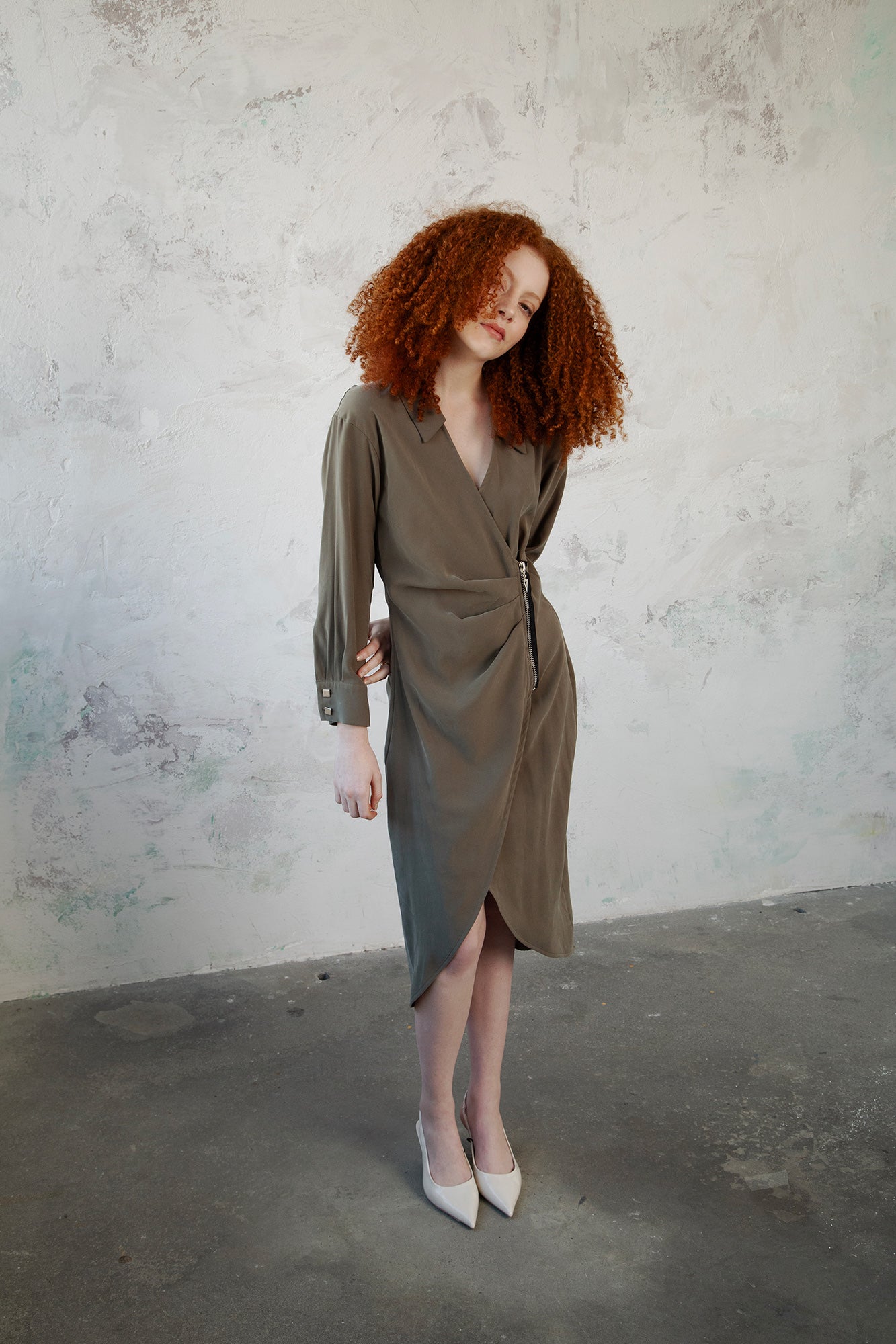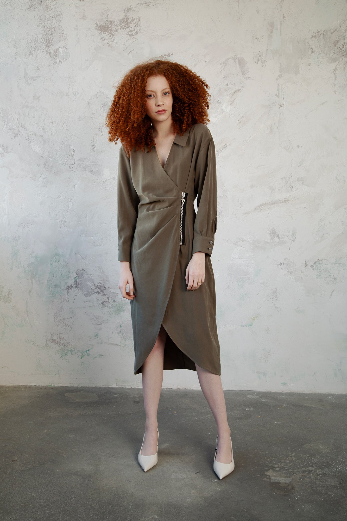 Khaki cupro wrap midi shirt dress with pleat and zipper details at the front