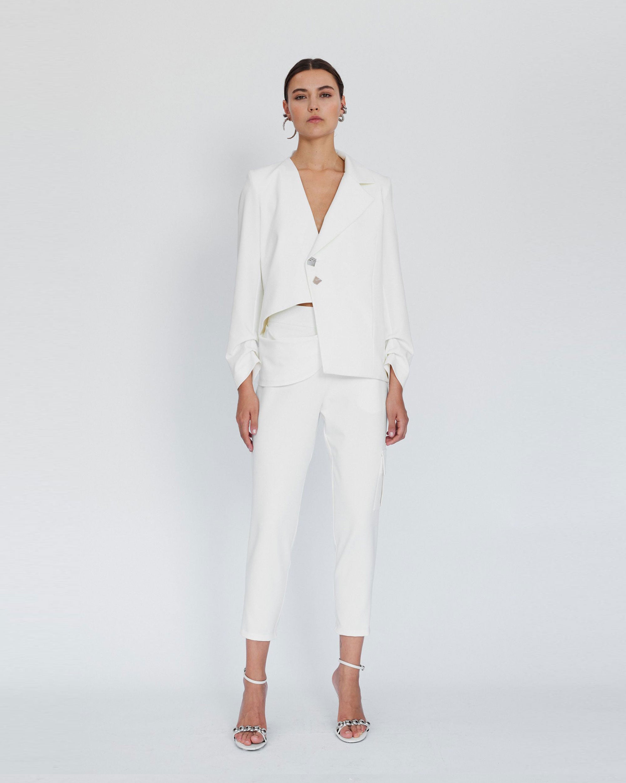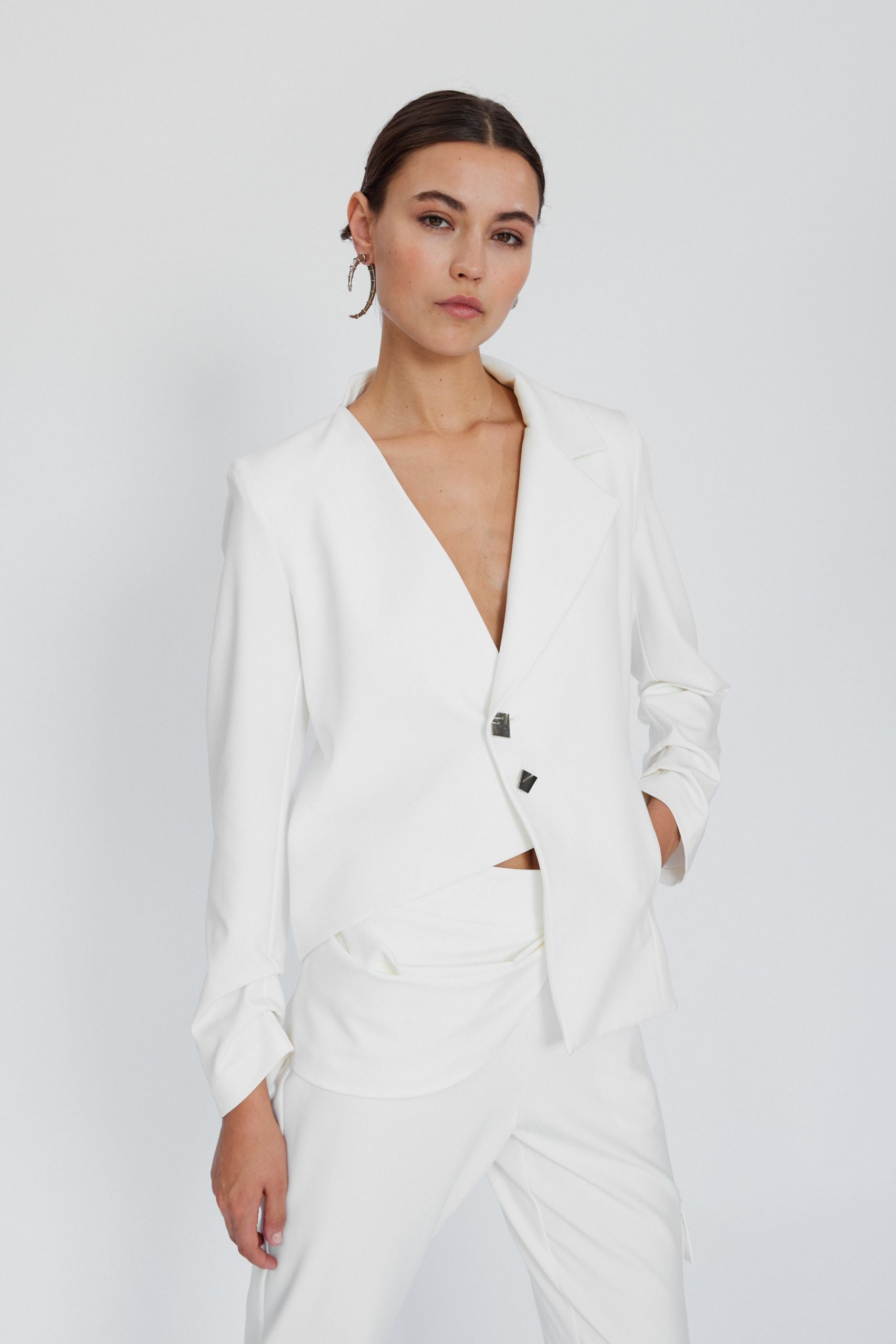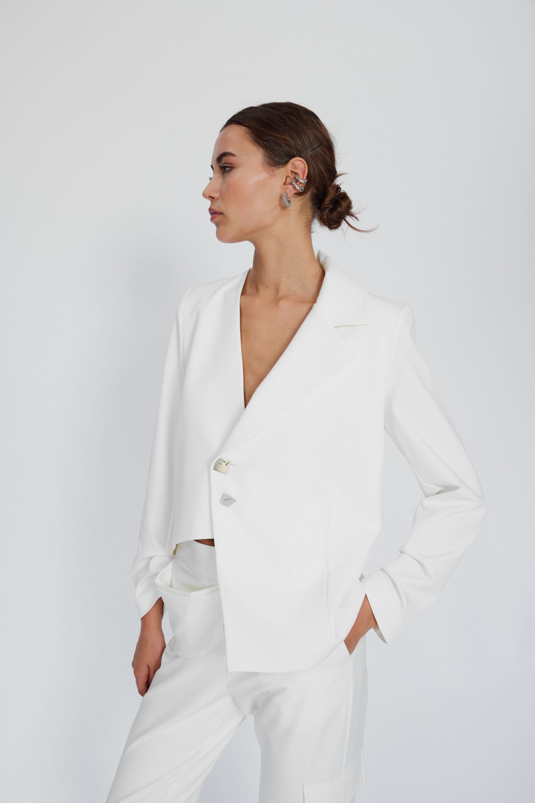 Asymmetry is everything for this white blazer jacket. Asymmetric hem, only one lapel (collar), triangle shape on one side and two different sized buttons, Defined by its asymmetric details, this comfy chic blazer is tailored to stand out! It has padded shoulders and boxy shape for structure.