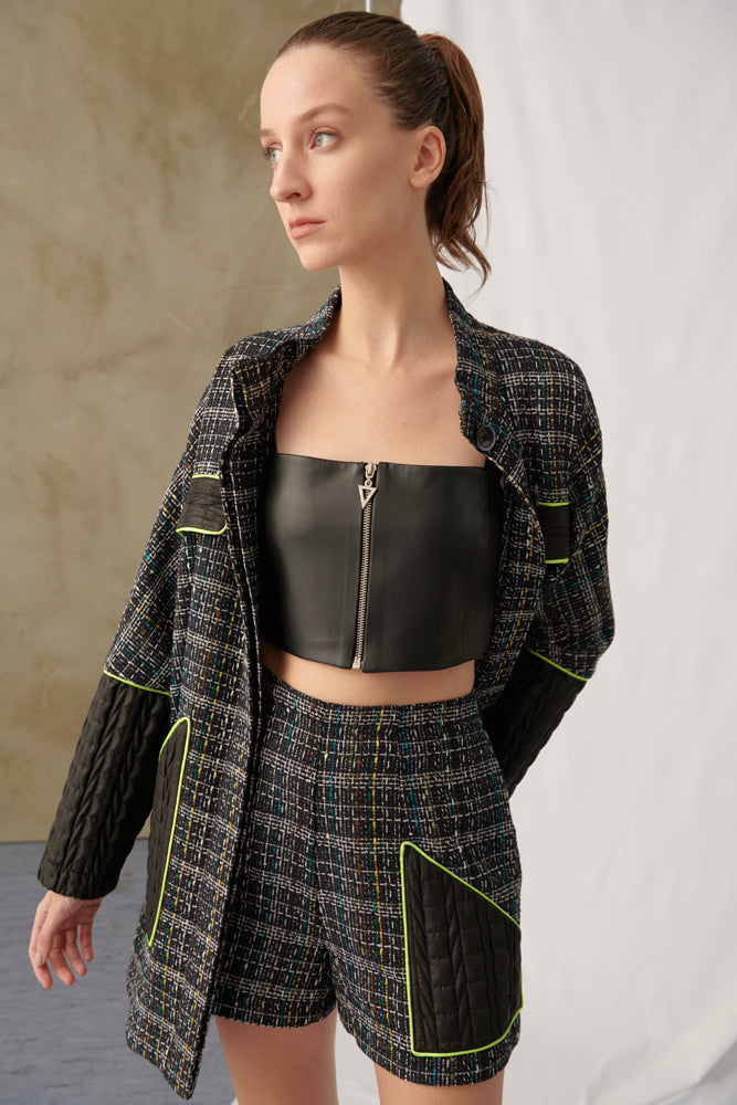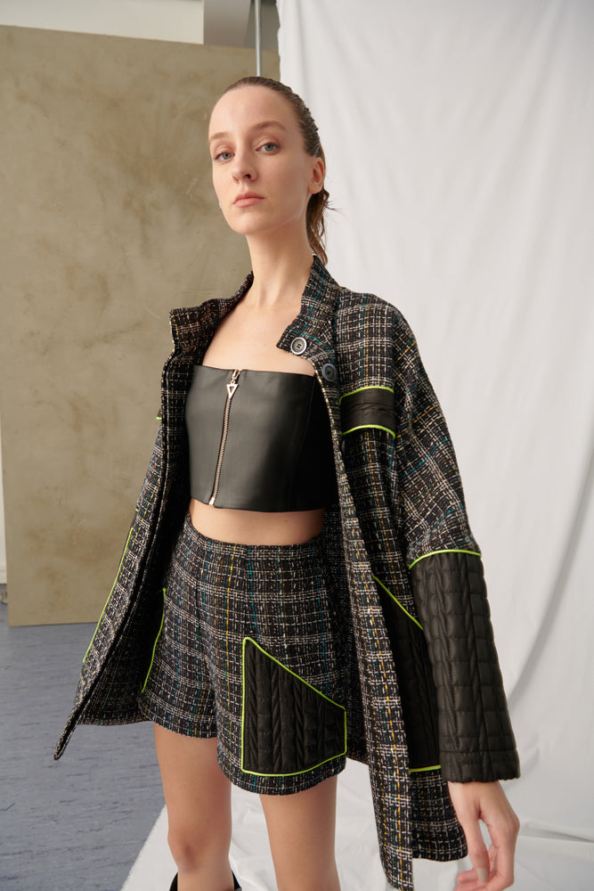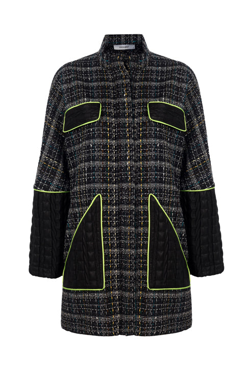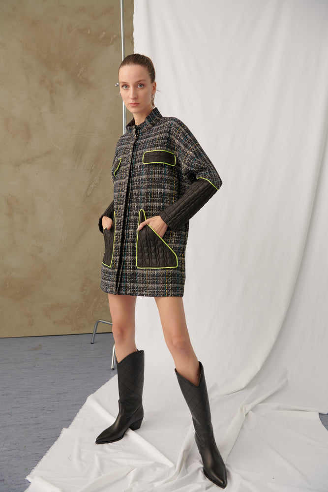 An unexpected combination of tweed and quilted fabric with neon details! You may use it as a dress or jacket (all buttons up at front).
