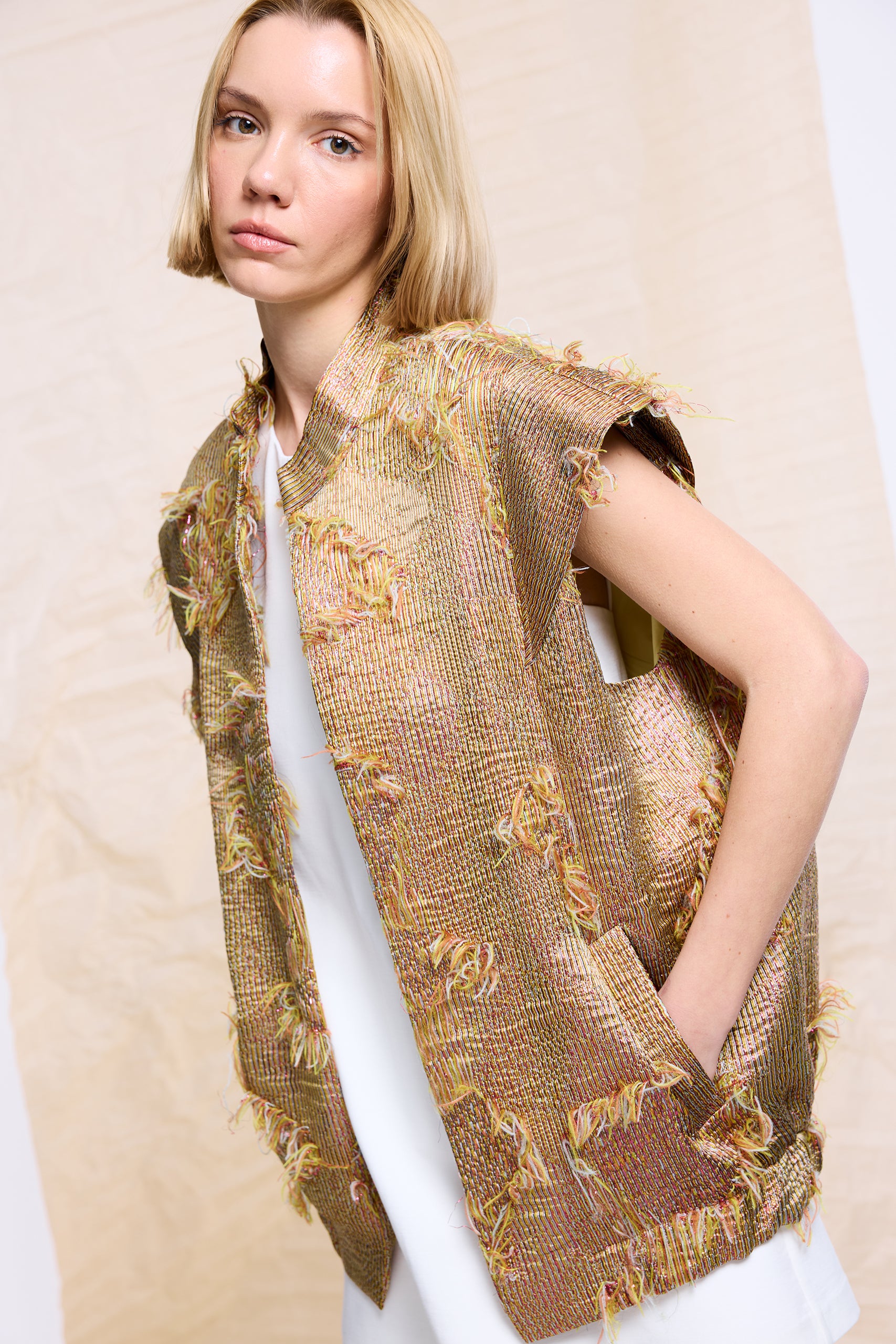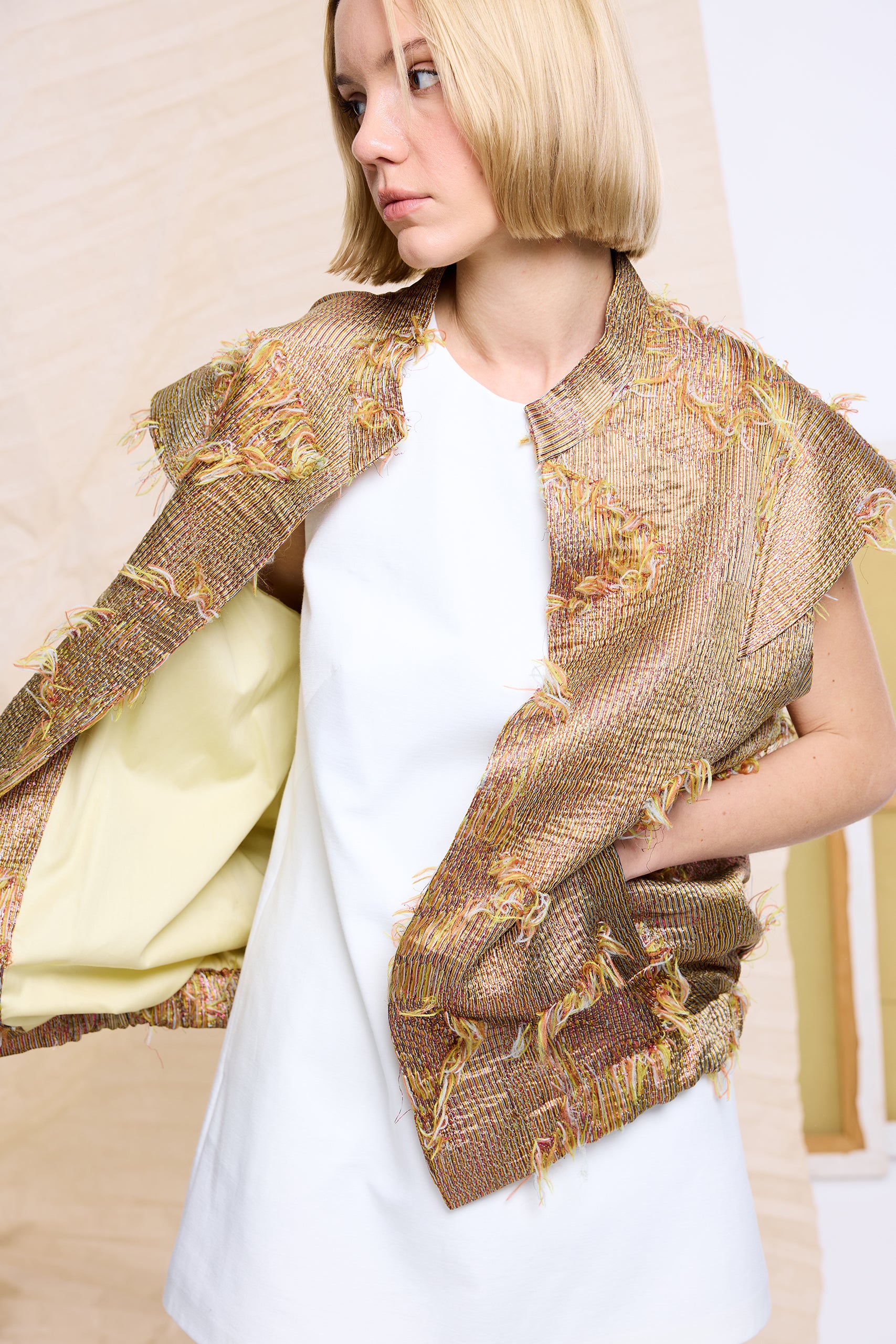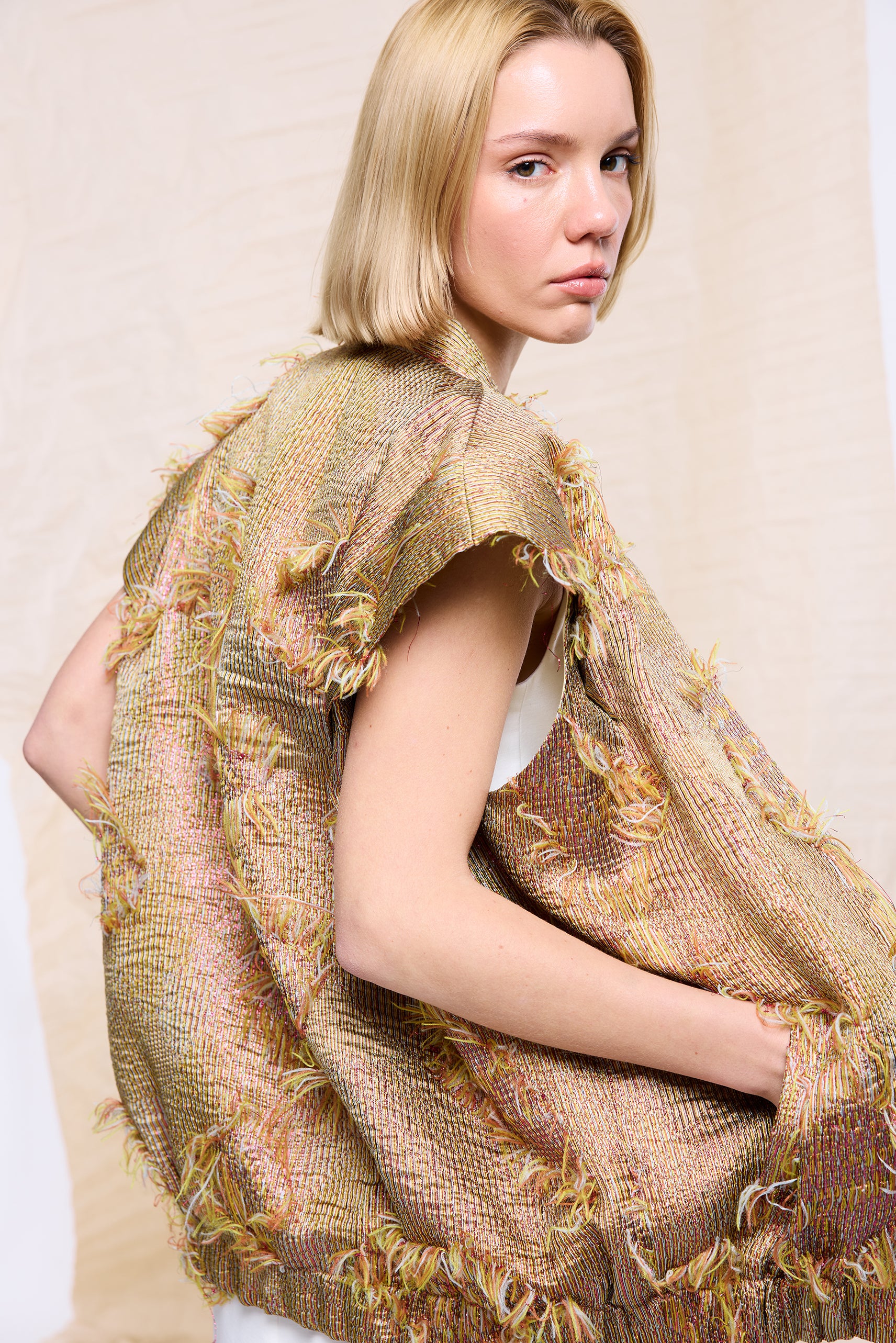 Crafted from unique fringe jacquard fabric, this bomber vest is a true statement piece.