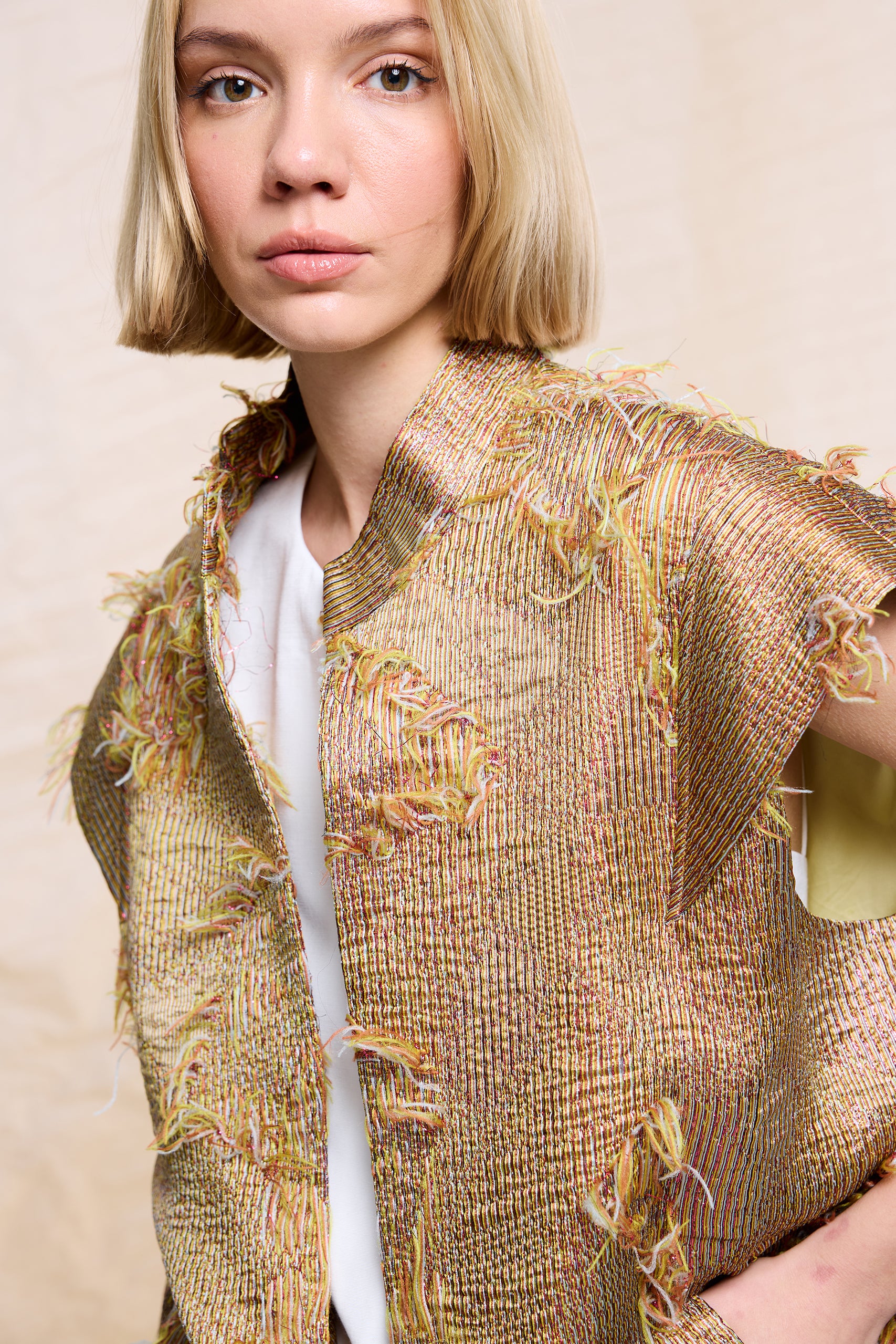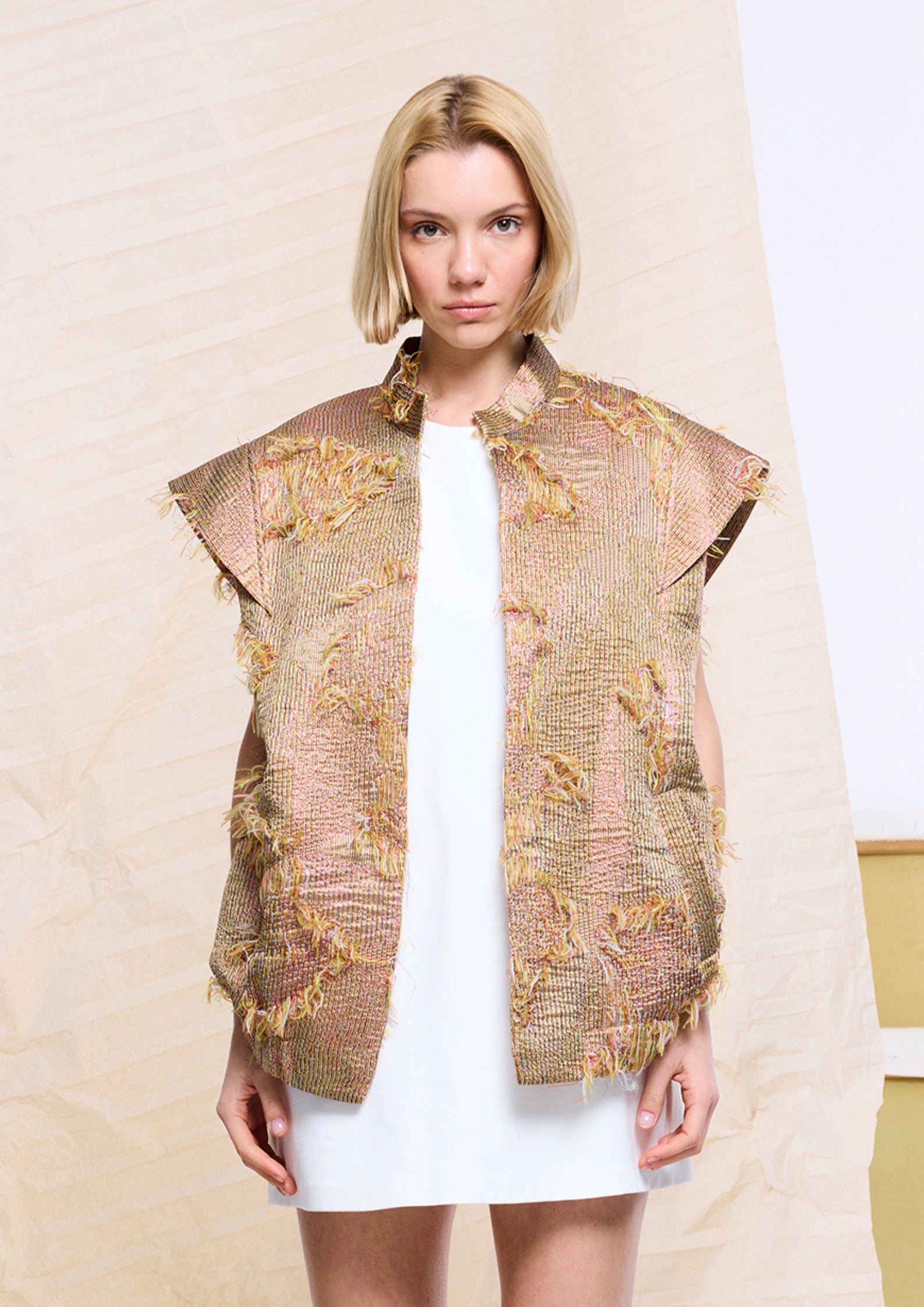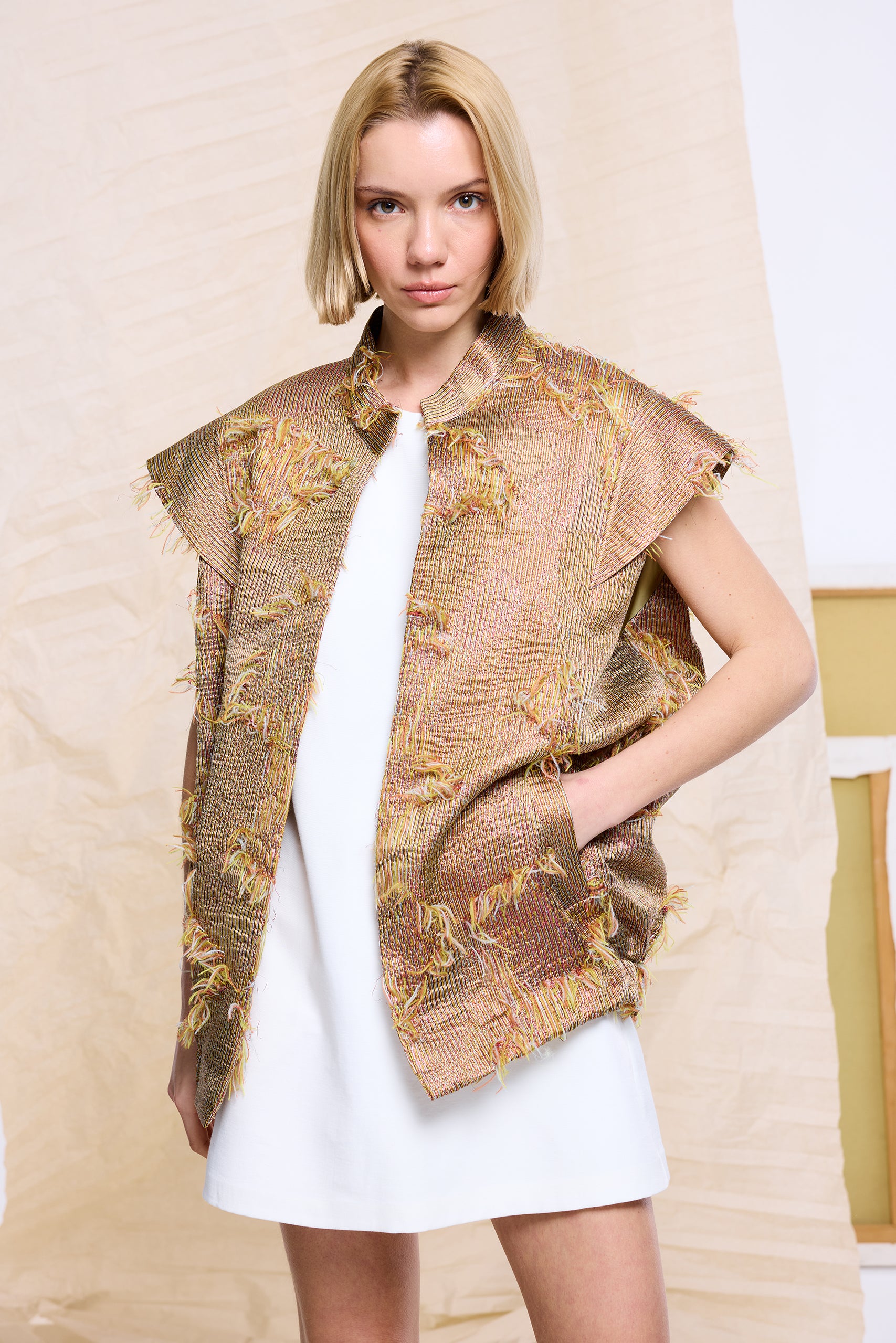 Crafted from unique fringe jacquard fabric, this bomber vest is a true statement piece.