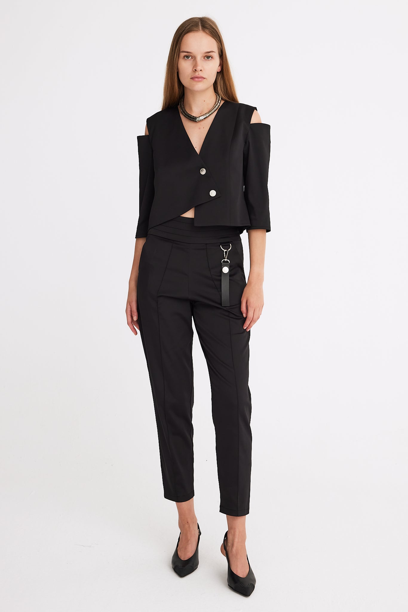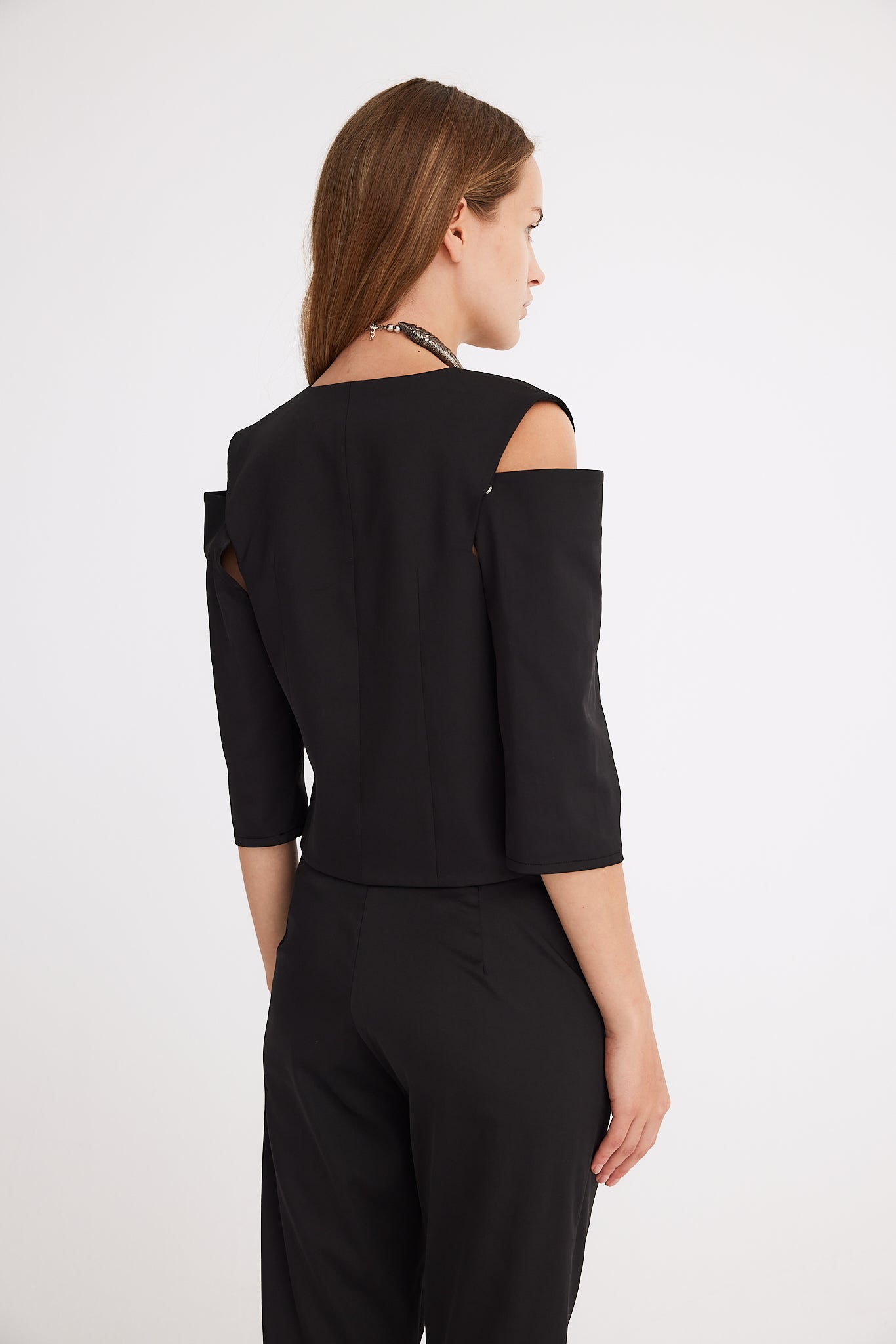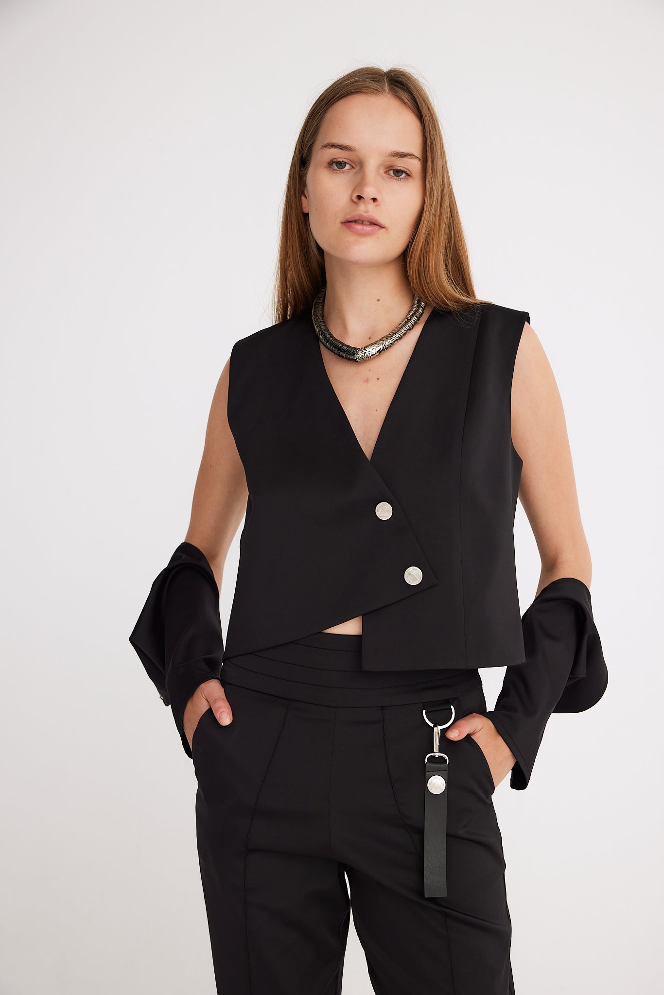 Rendered in Black, this piece pairs perfectly with the matching Moody Pants for a cohesive, statement-making look
