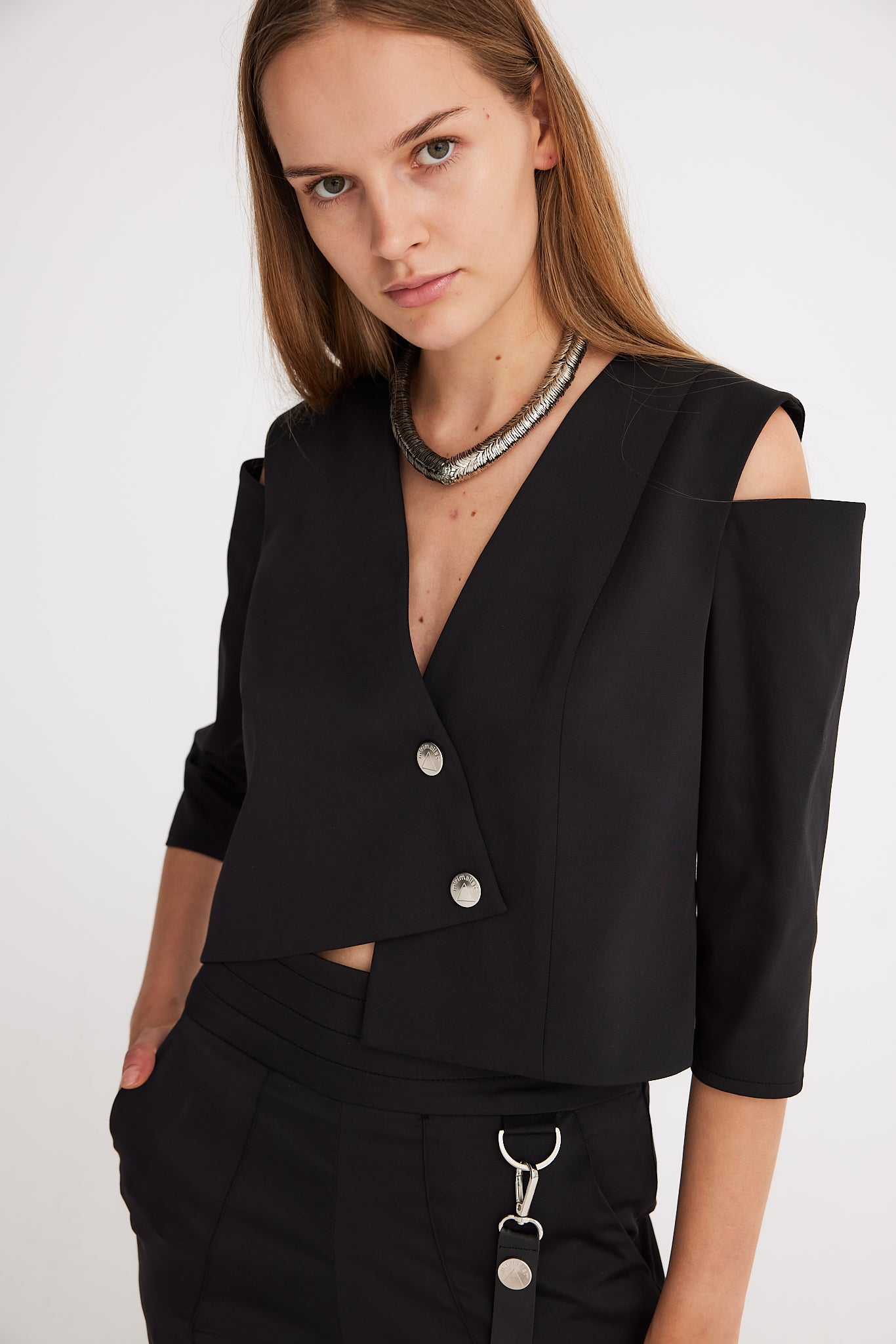 This asymmetrical jacket features a distinctive triangle design on one side, adding a modern edge to the silhouette