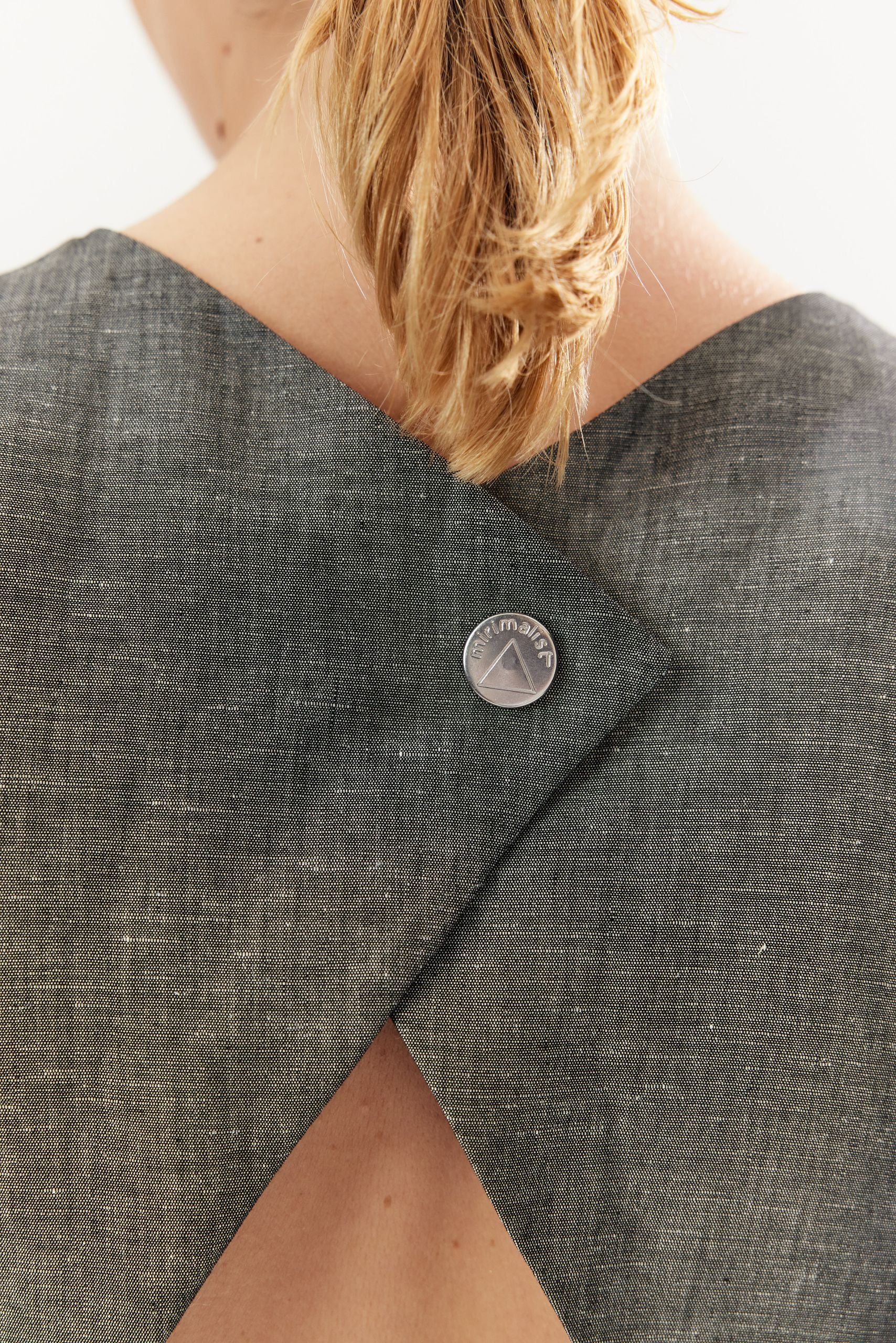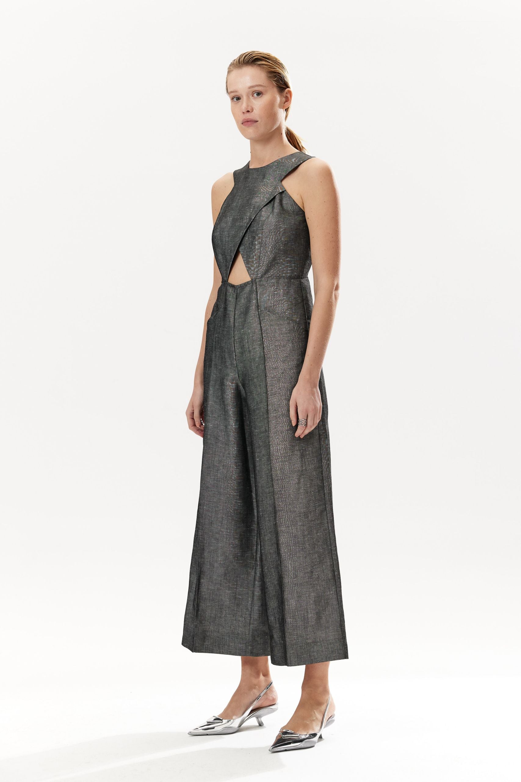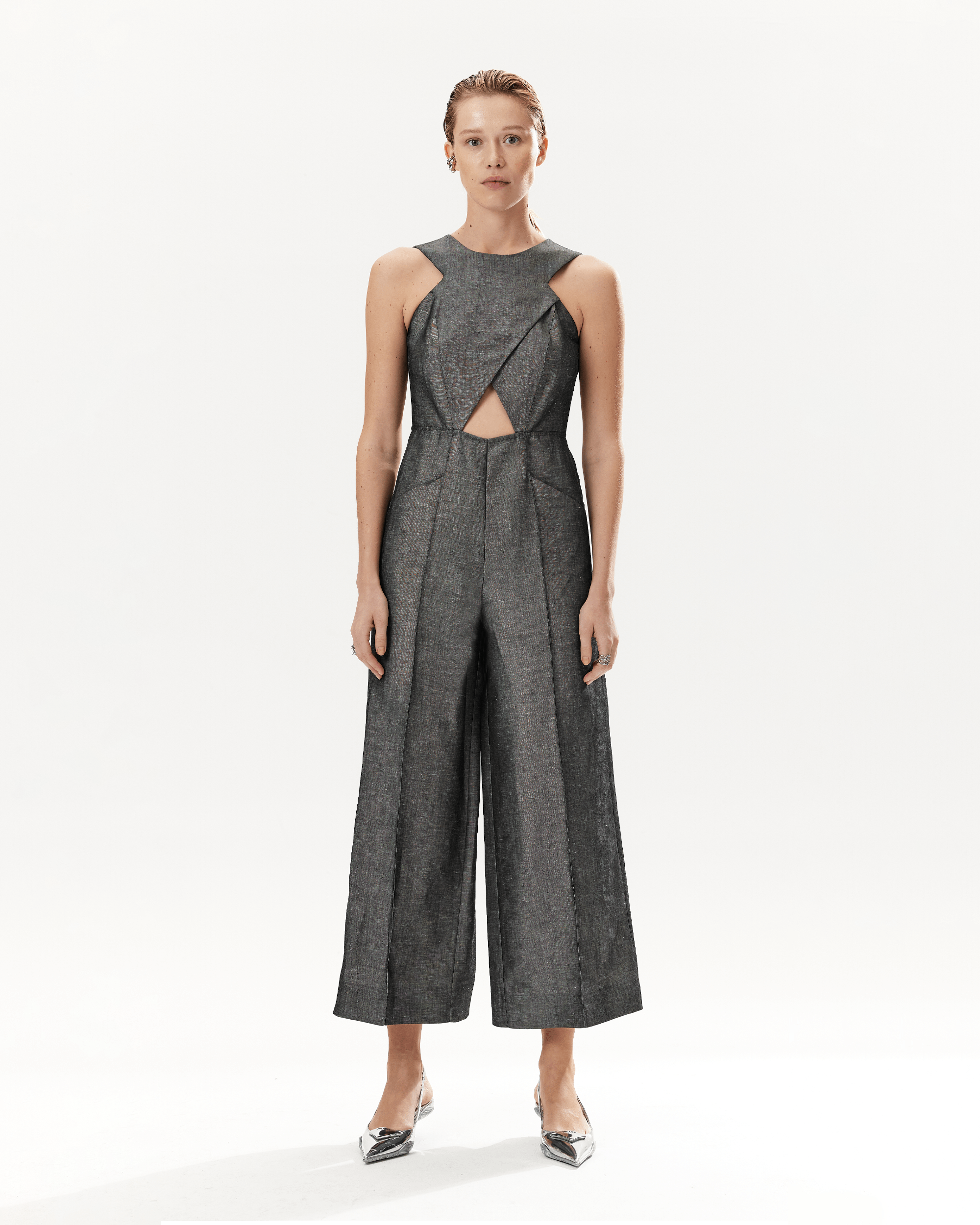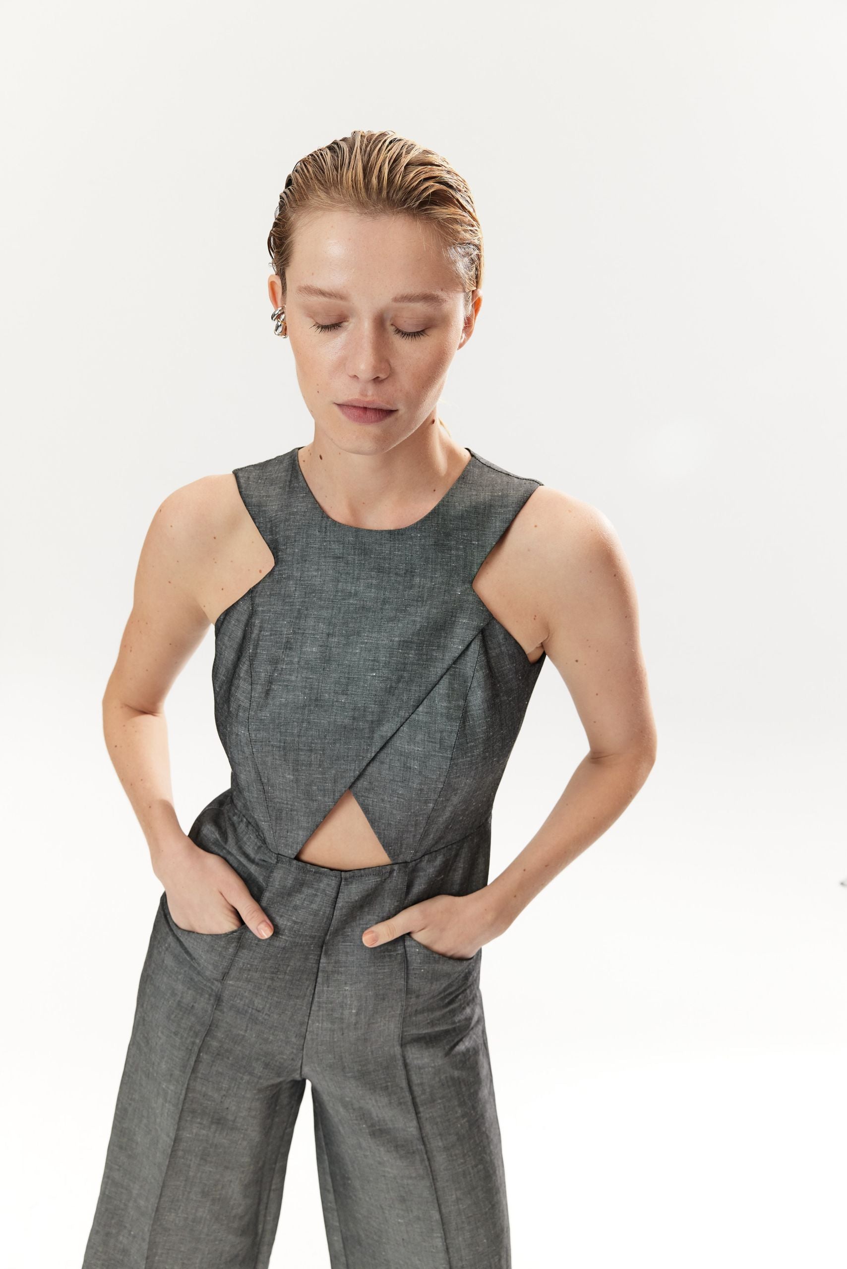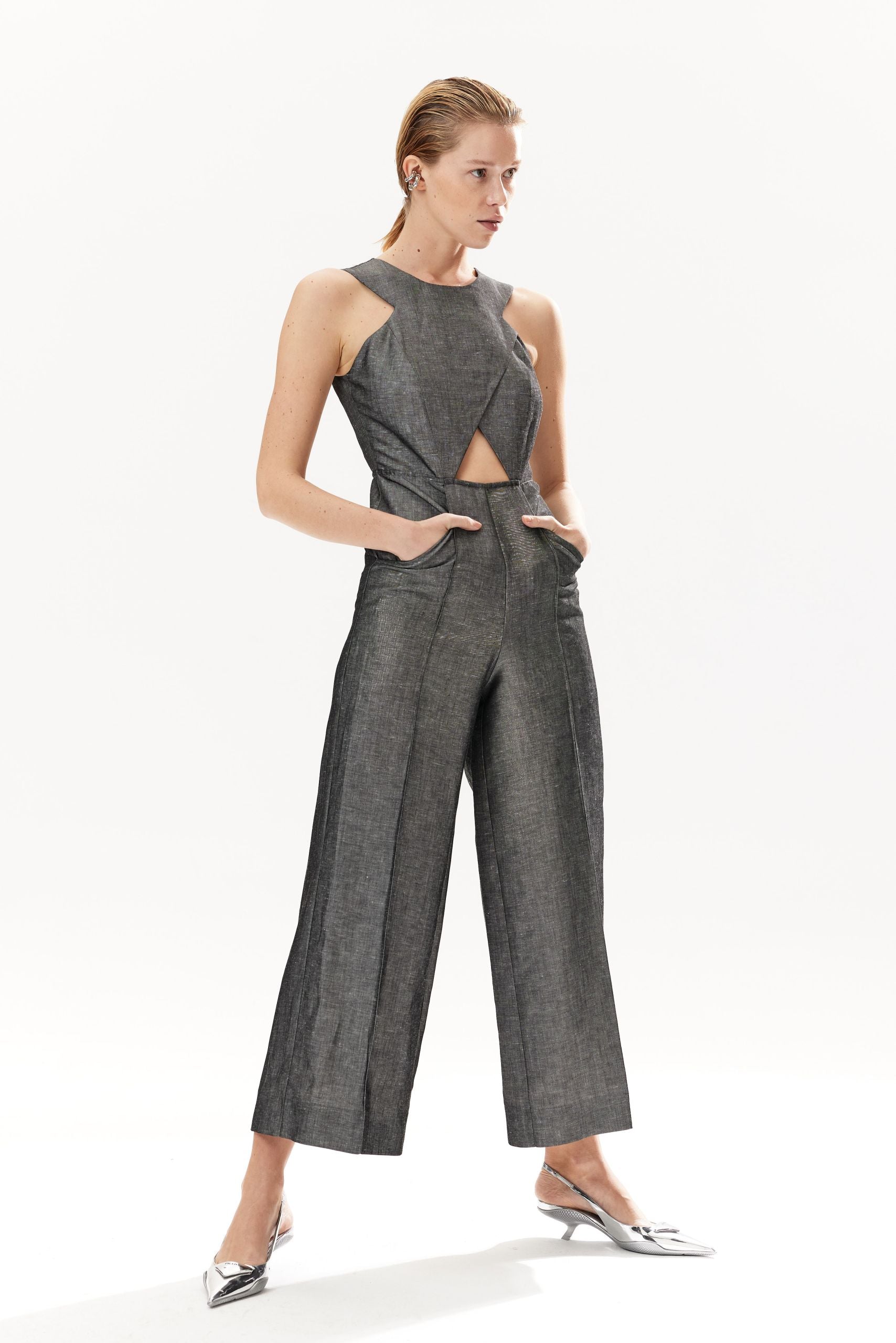Mirimalist signature halter neckline jumpsuit is made of linen-blend fabric