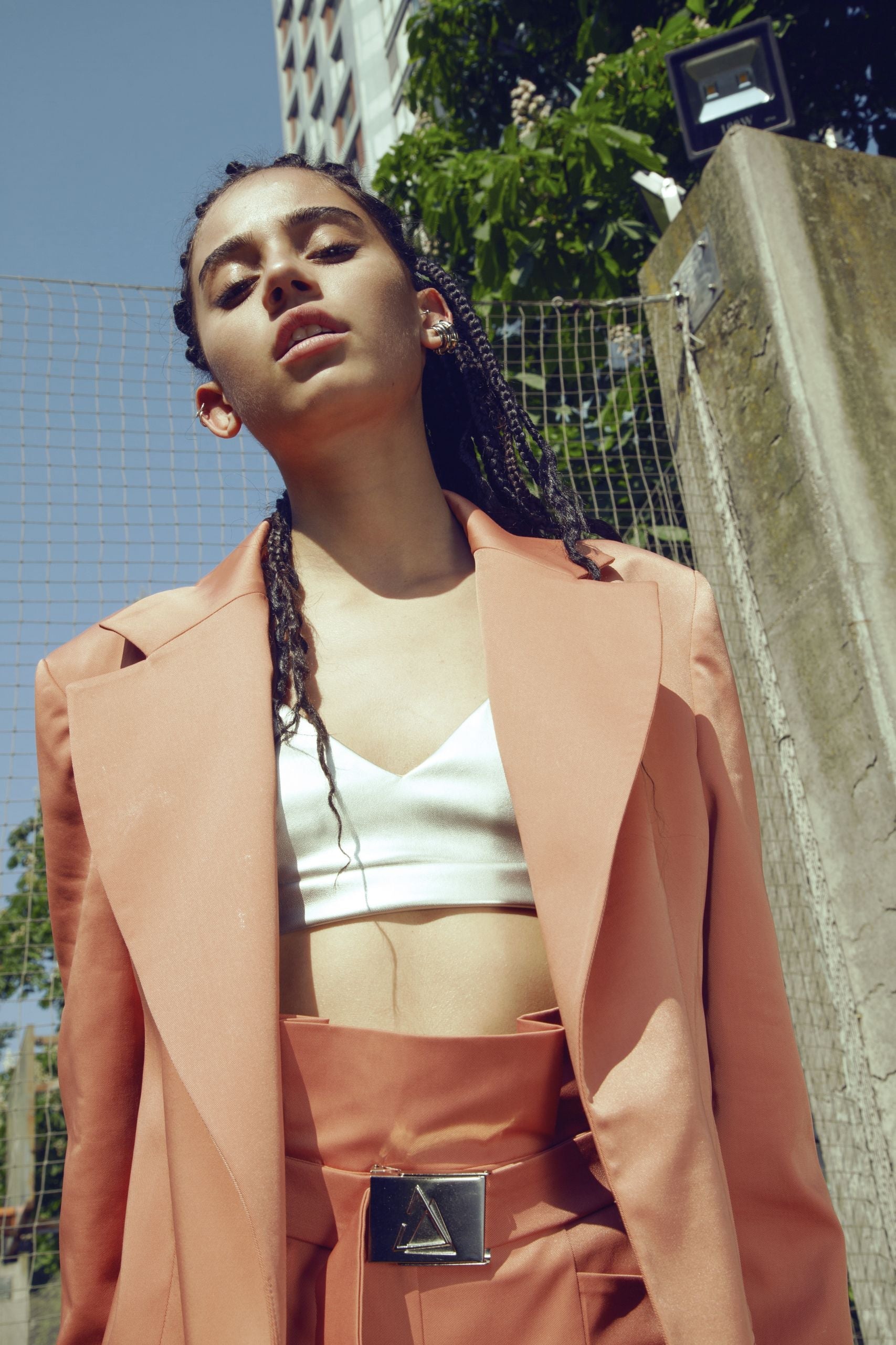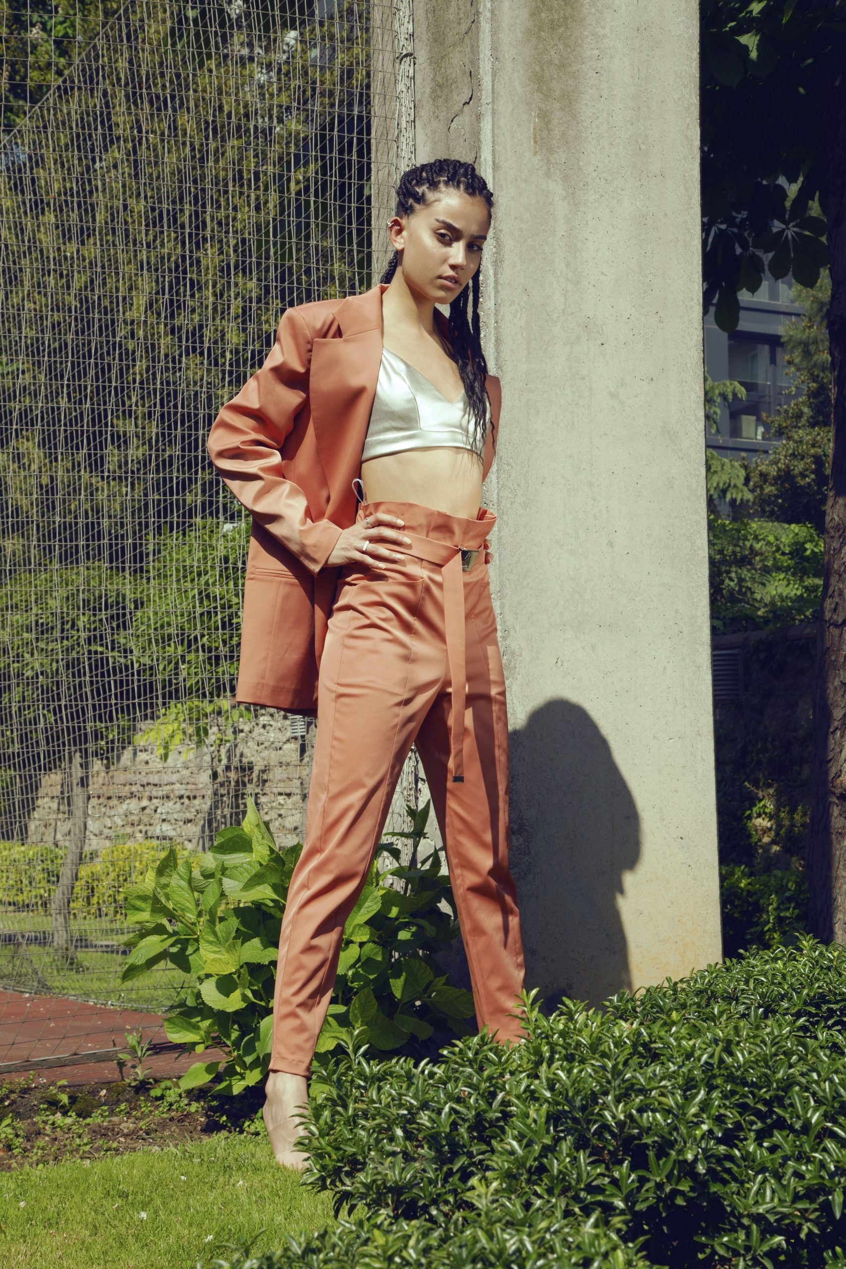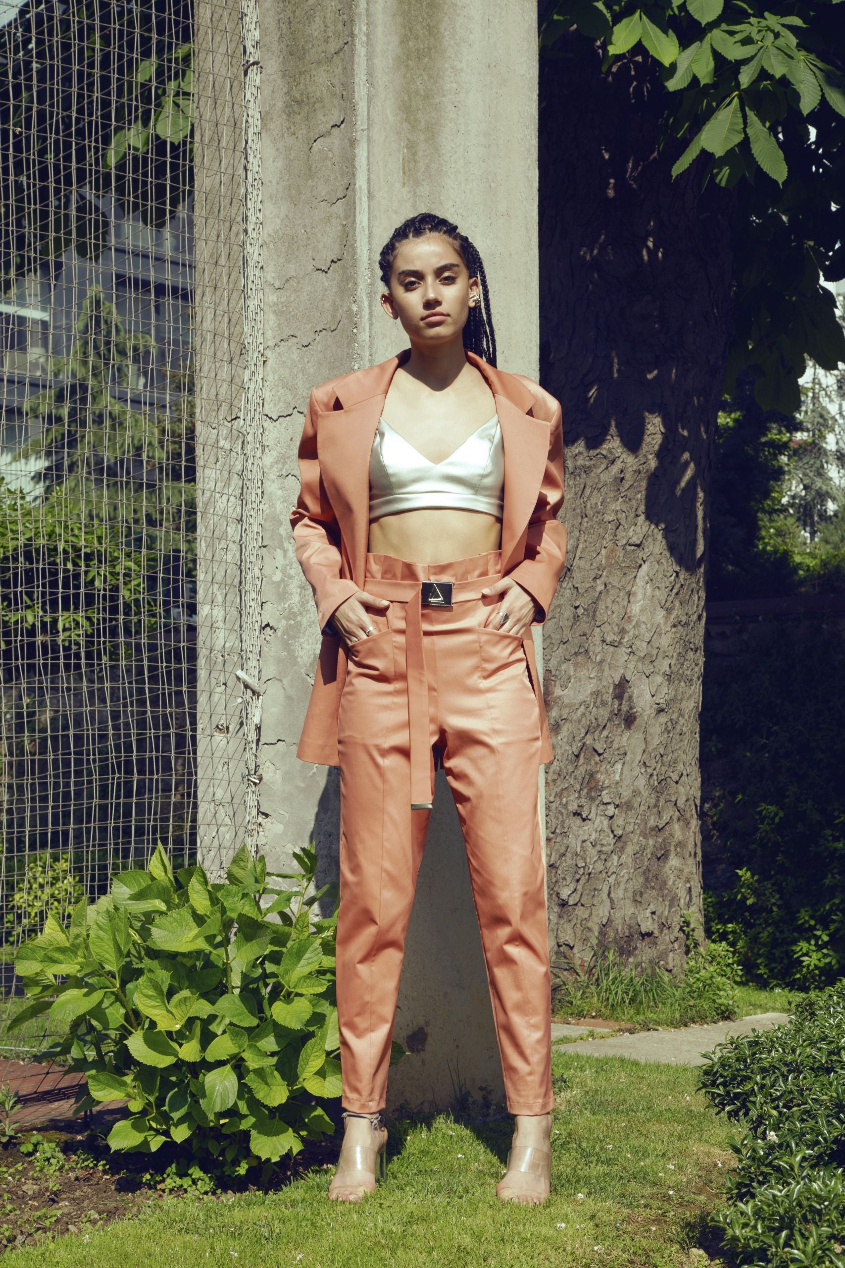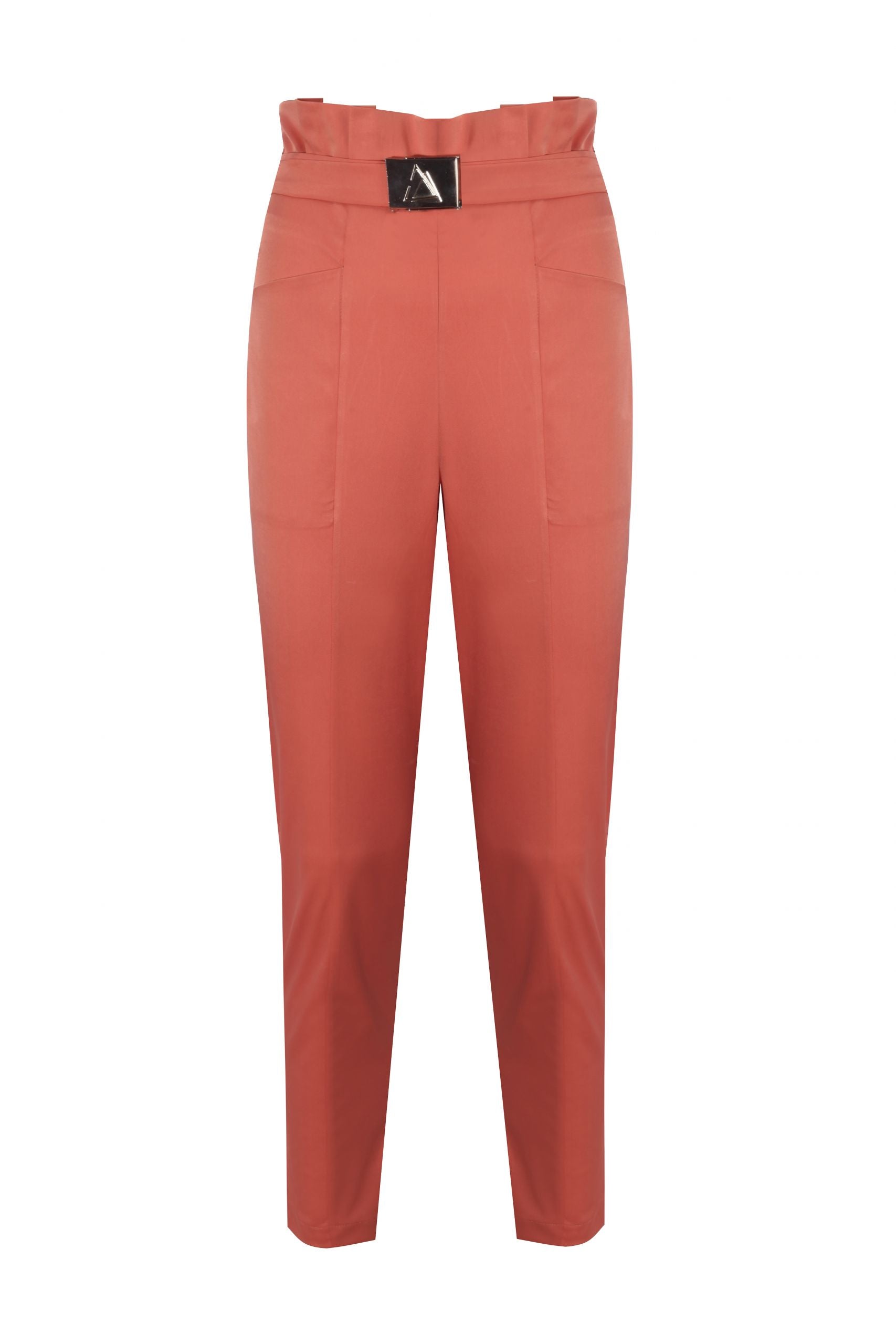 A very high rise carrot pants with a belt