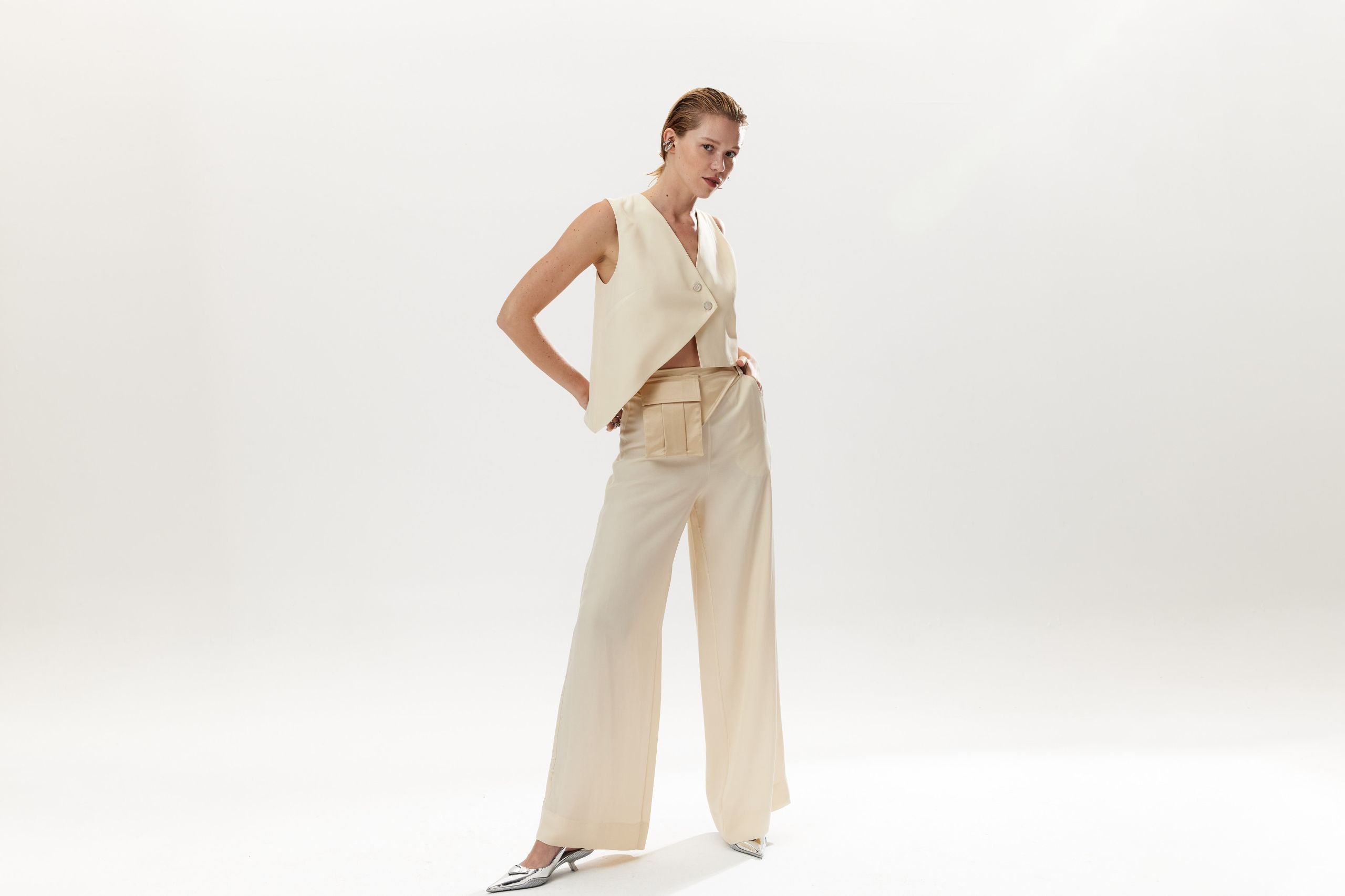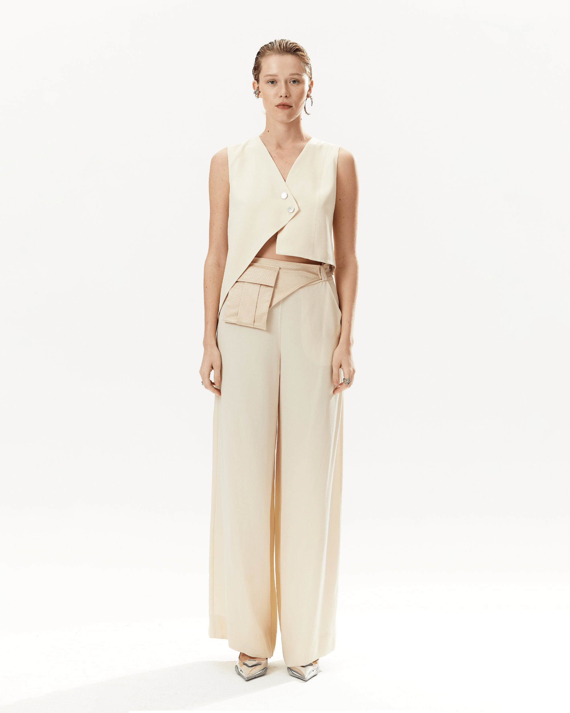 Loose maxi pants has wide legs and a removable belt with cargo pocket