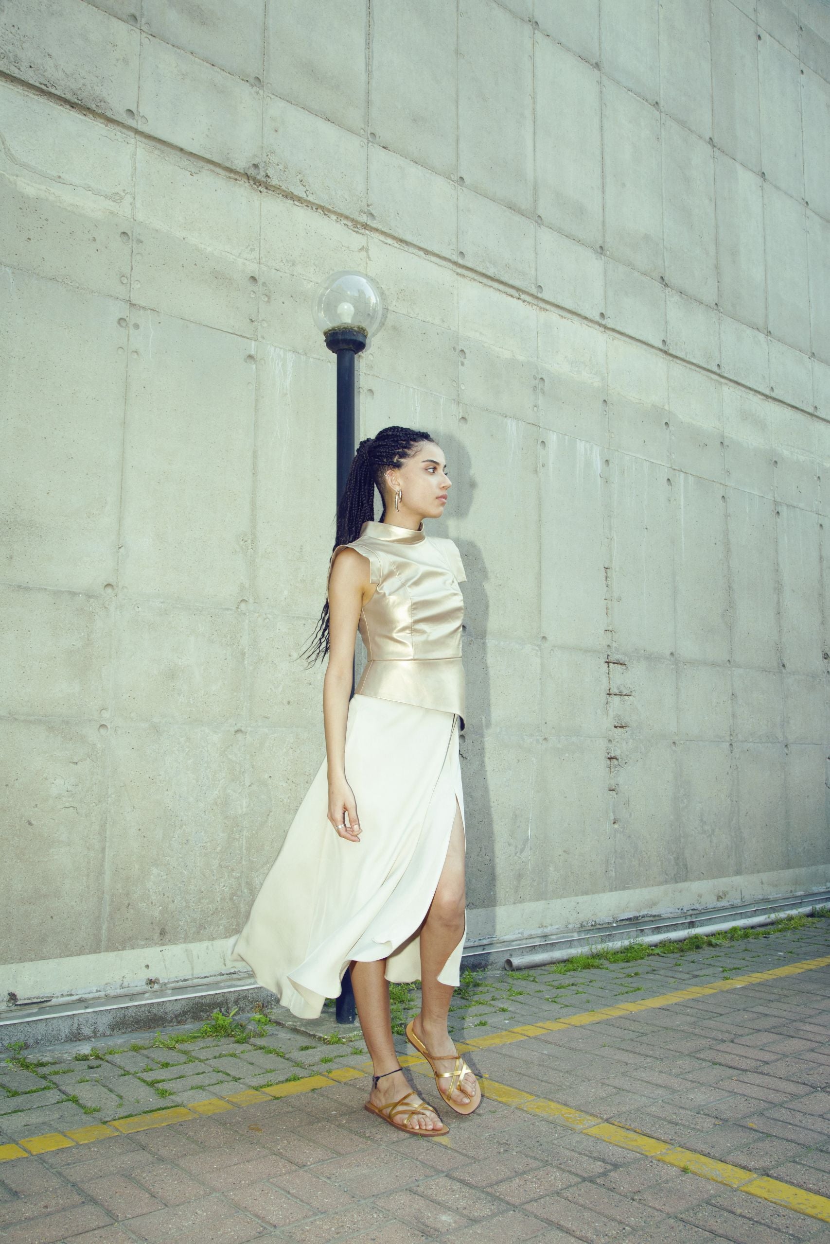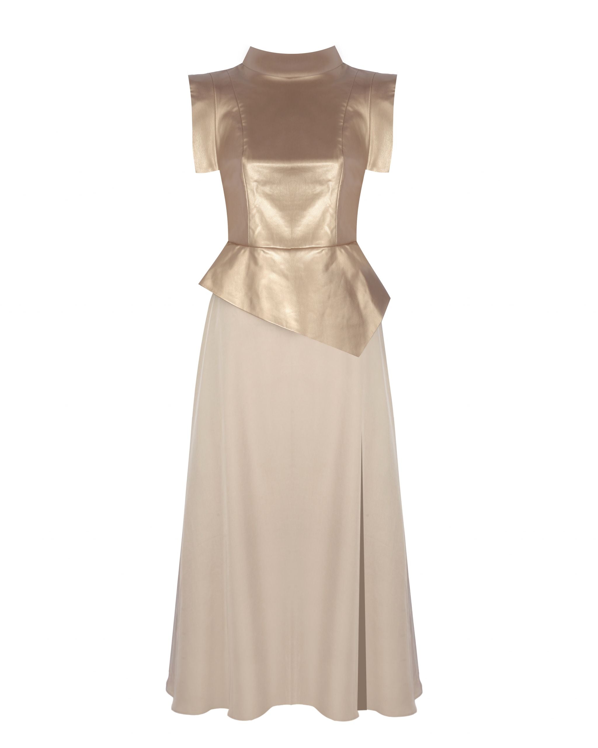 A gold/ecru midi dress with a vegan leather top and a tencel loose skirt