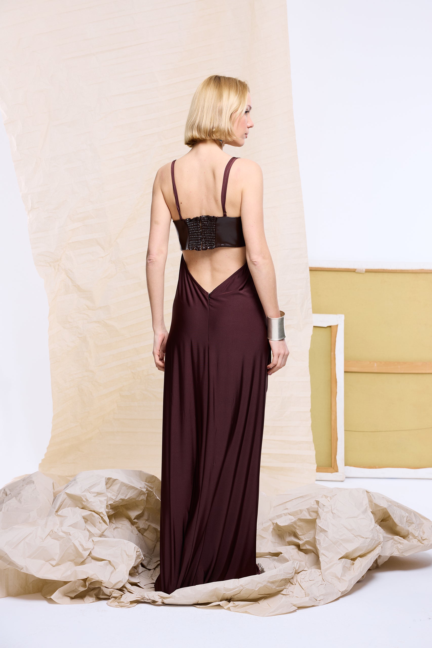 Crafted from the dark brown combination of jersey and vegan leather, it’s perfect for effortless summer night.