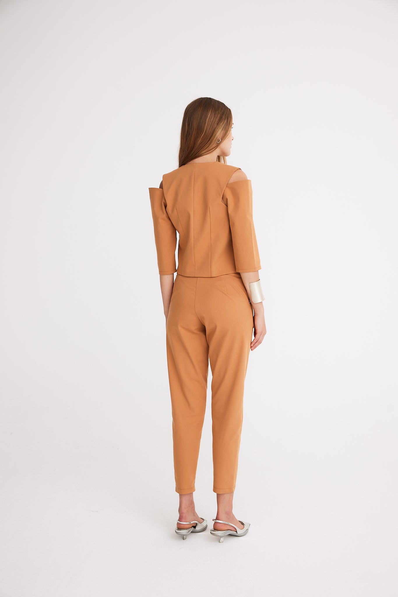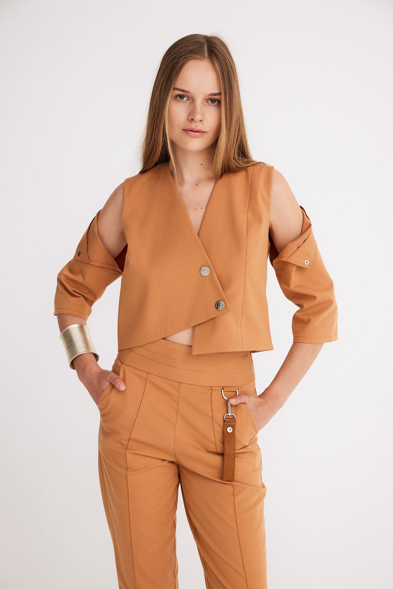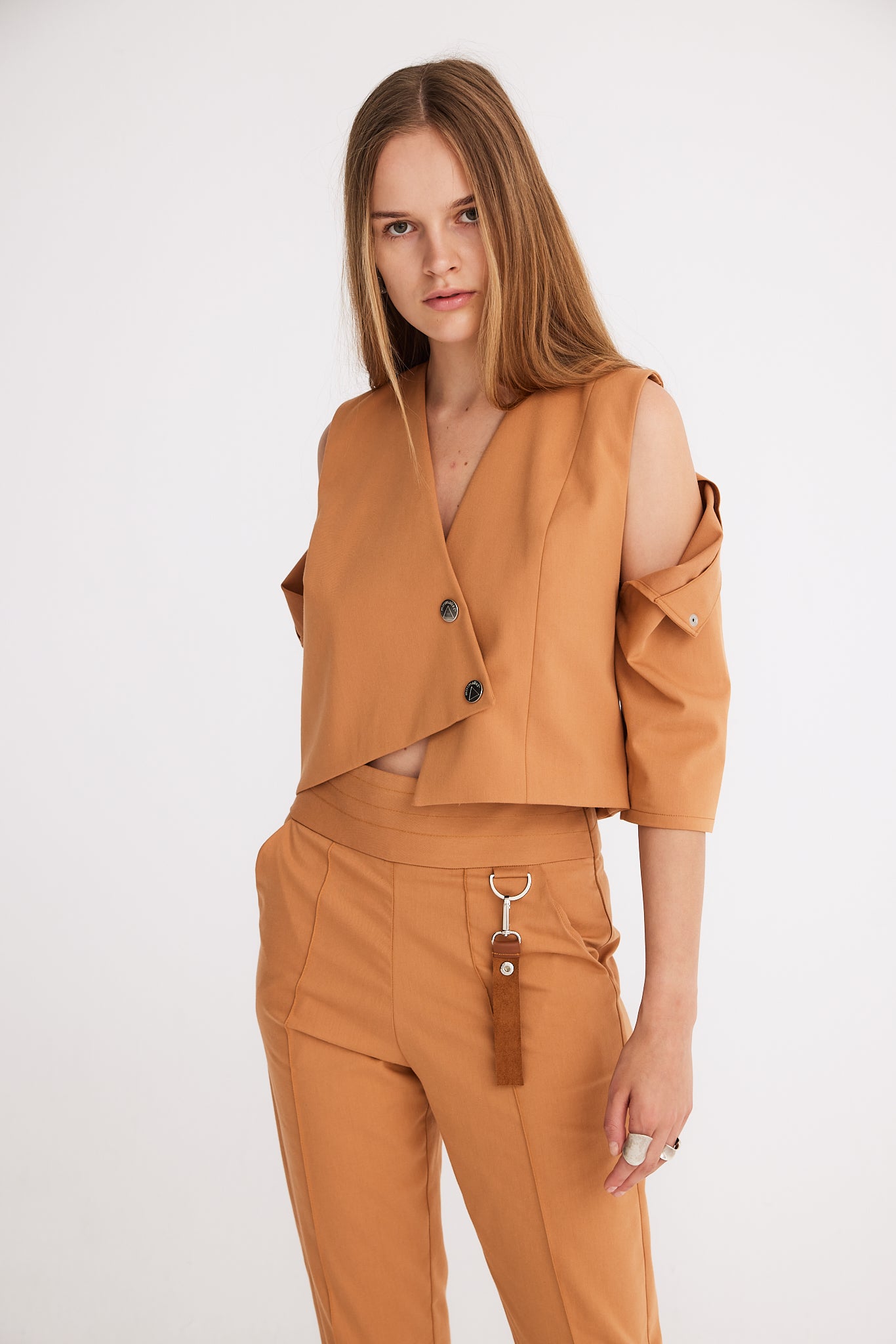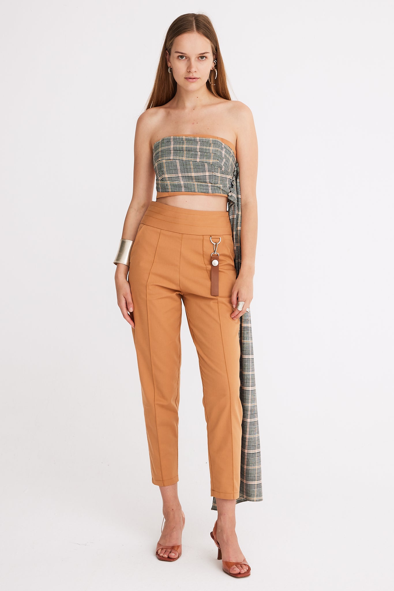 These straight carrot fit pants are enhanced with a corset-shaped belt for a stylish silhouette