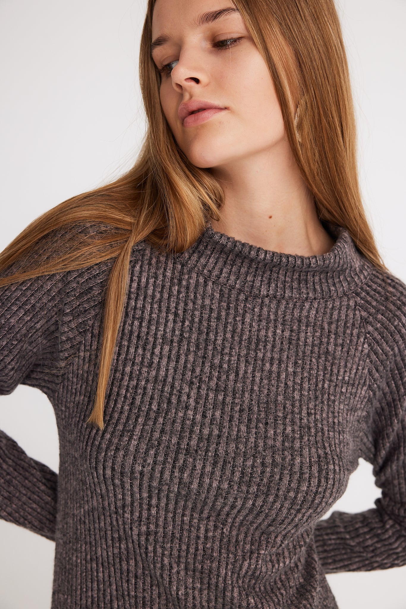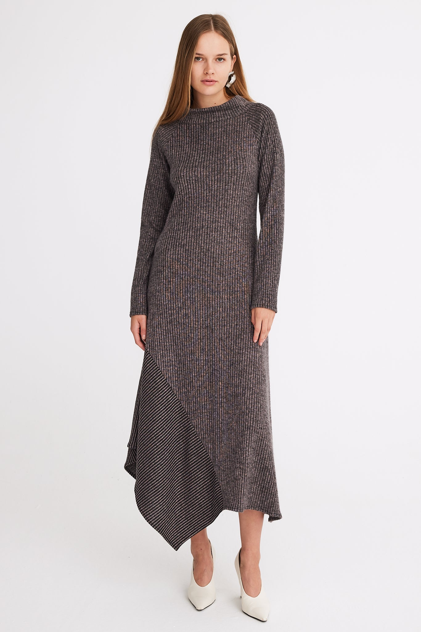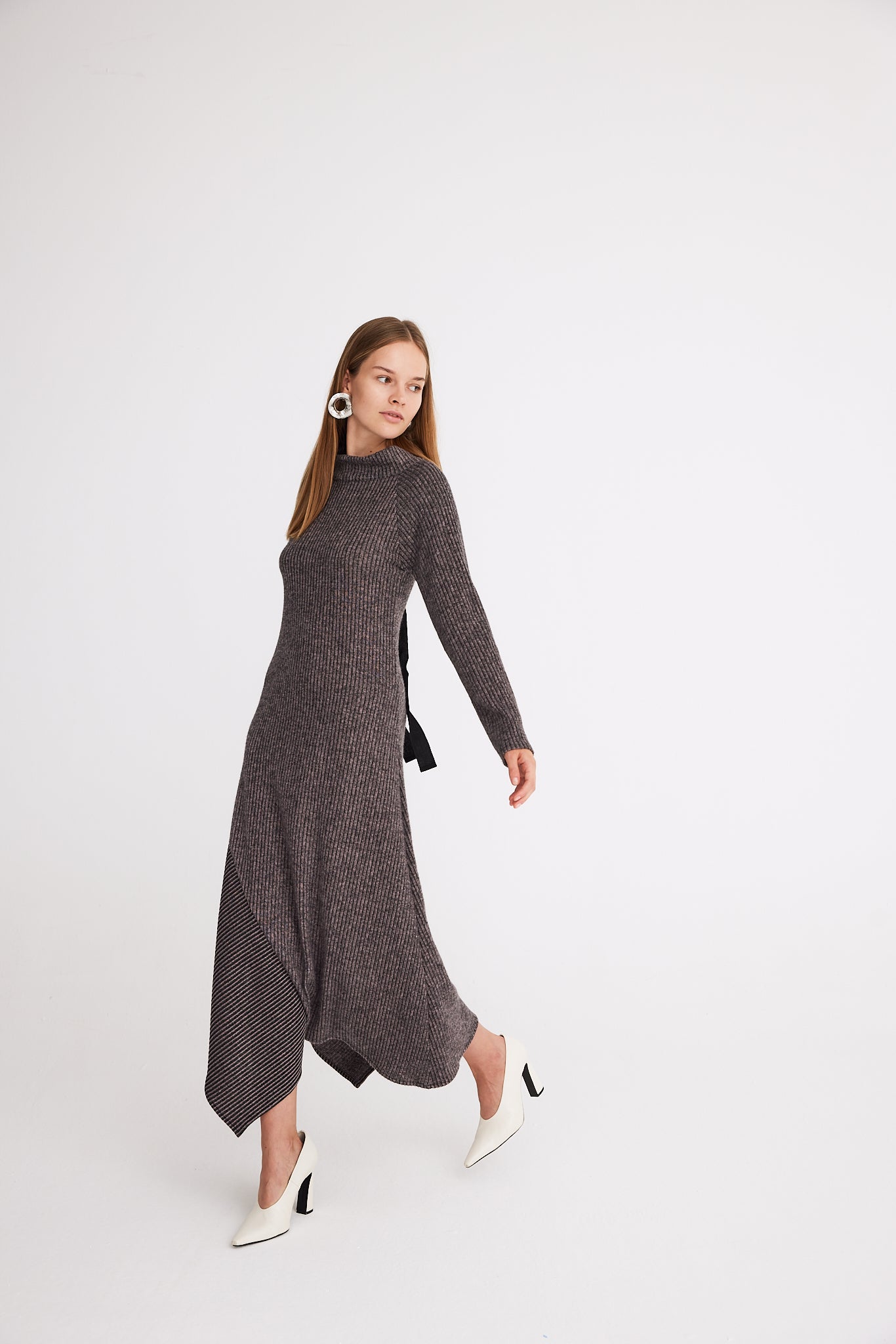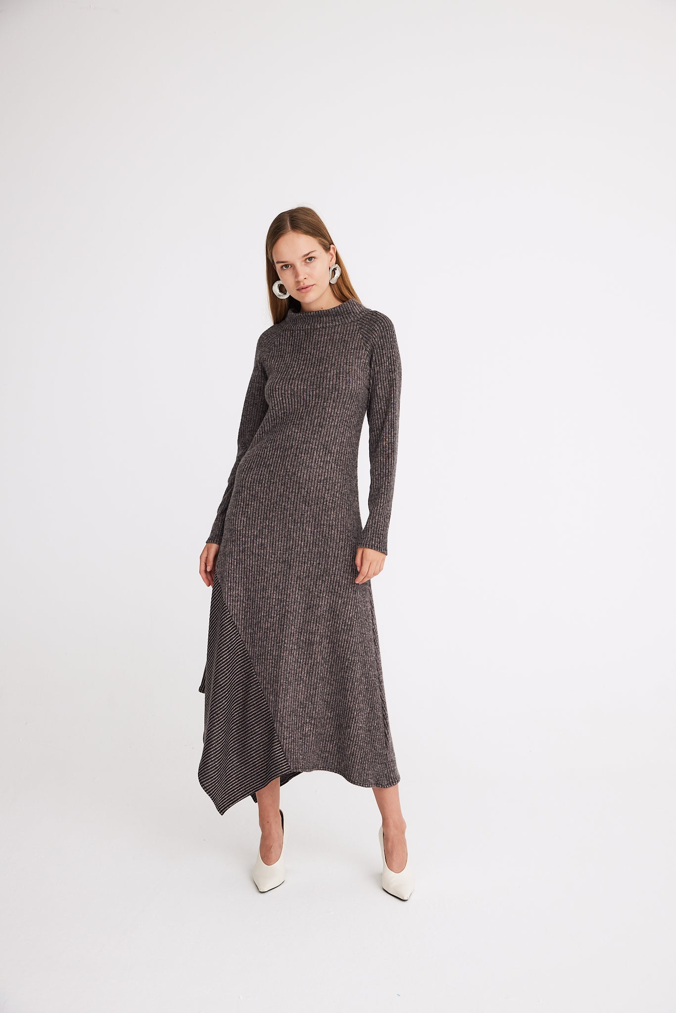 Crafted from a dark grey and pink blended knit fabric, this dress is both cozy and eye-catching.