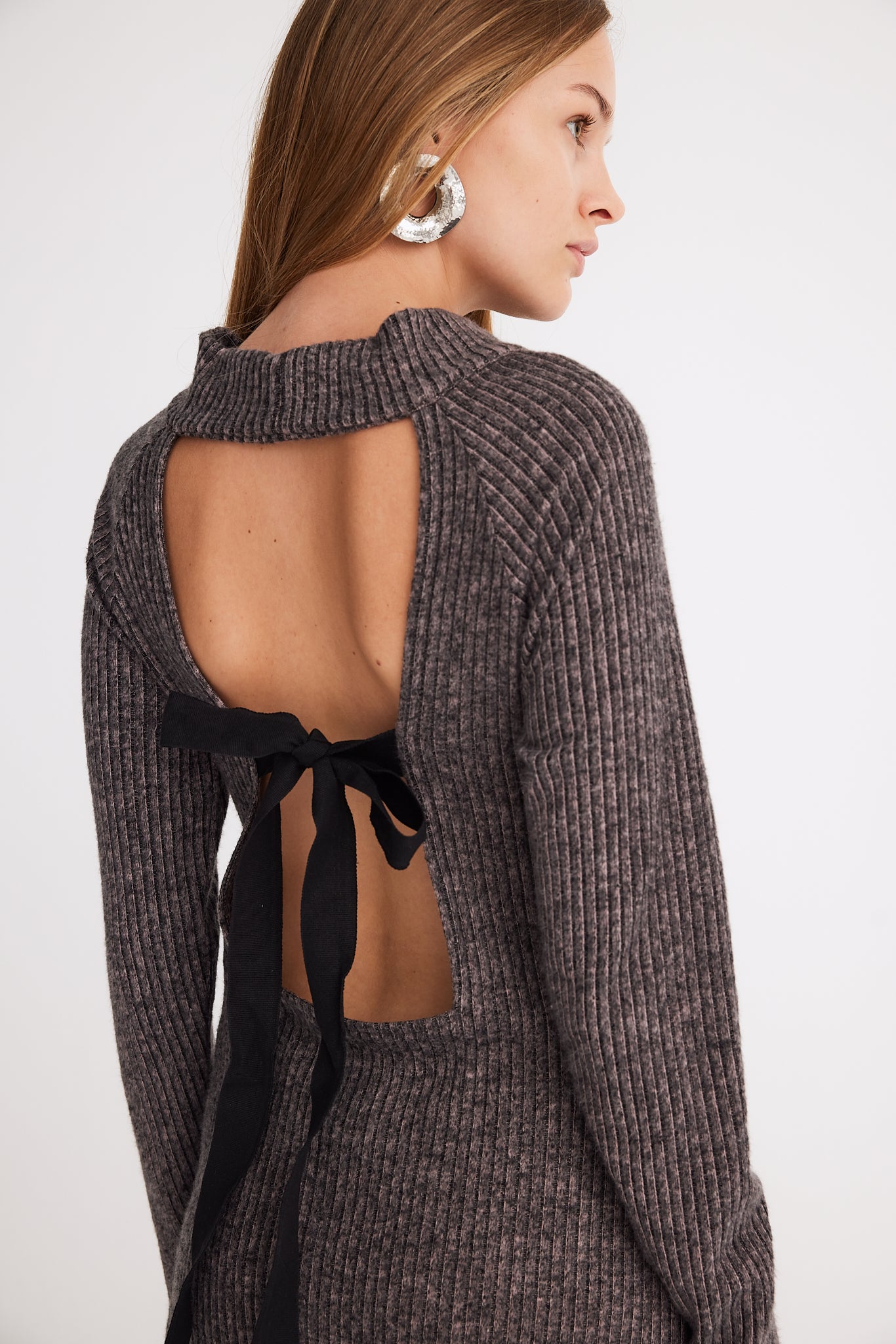 Its standout features include an asymmetric hem and an open-back cut, adding a bold, elevated touch.