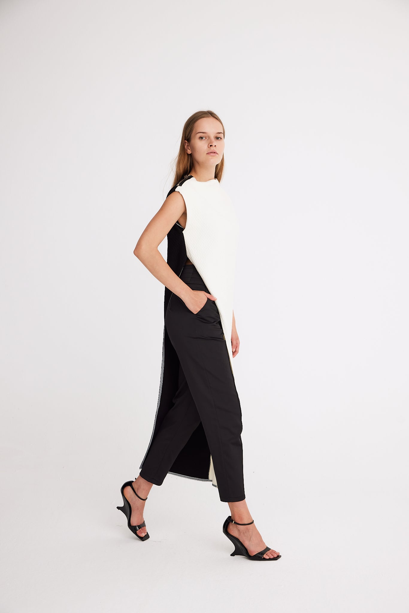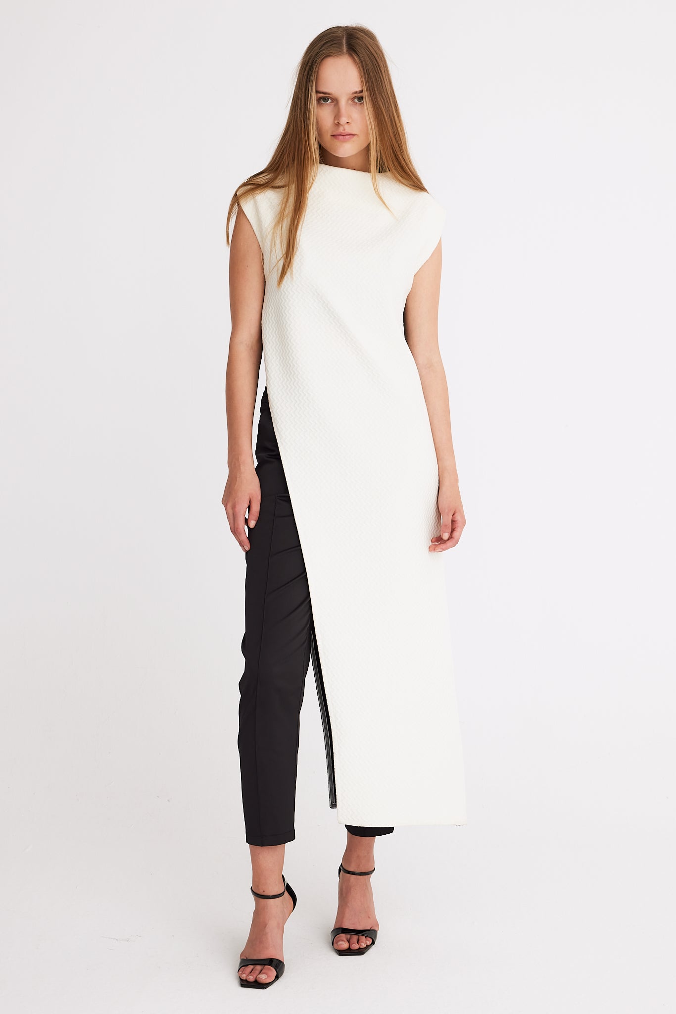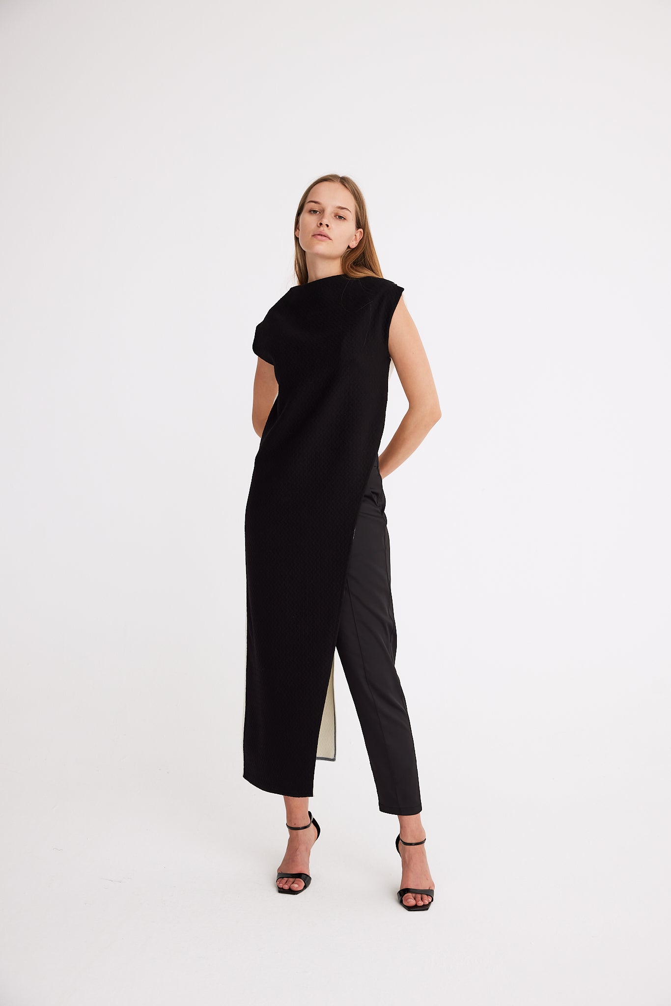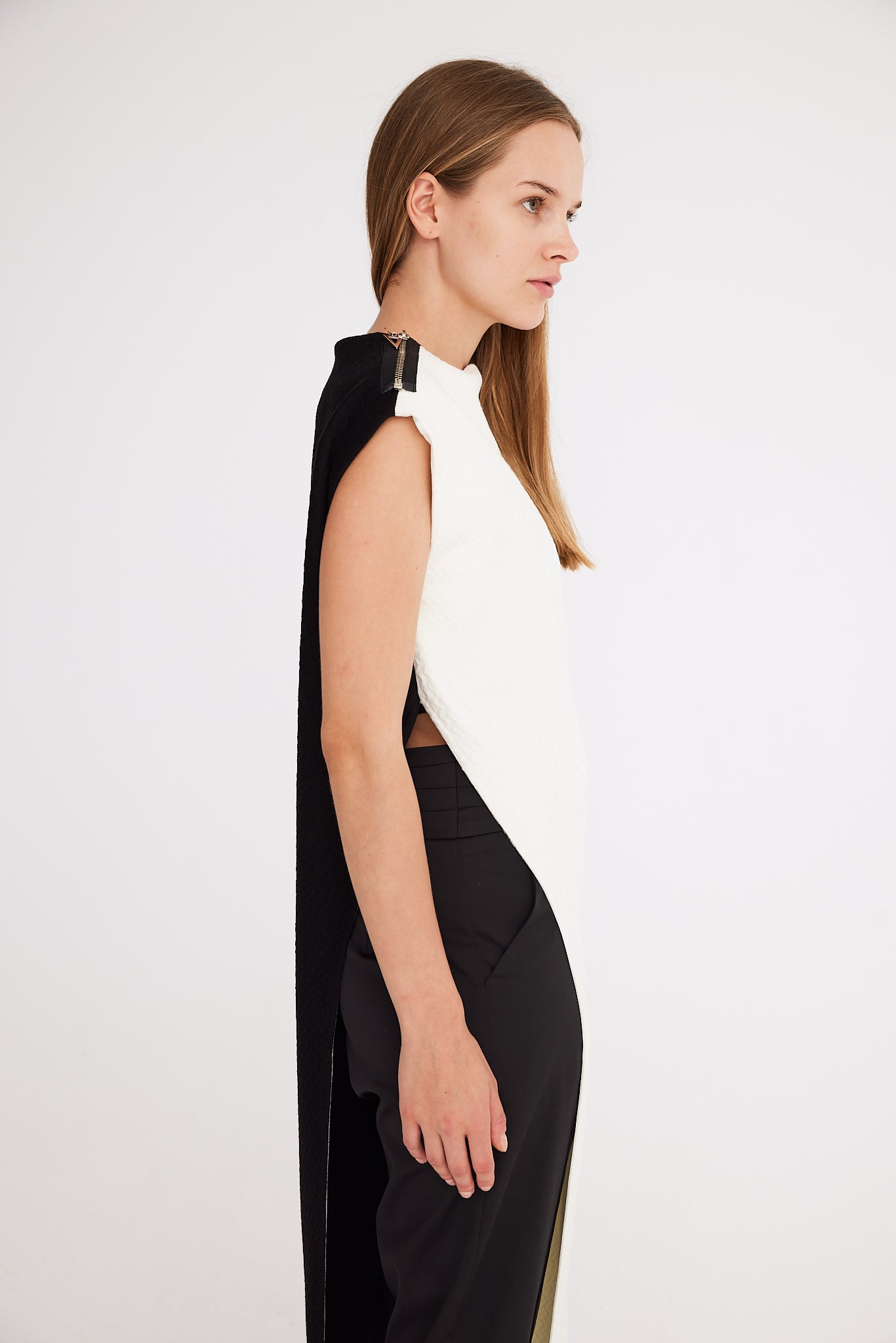 With one side in white and the other in black, this long asymmetrical tunic allows you to choose your front for a versatile look.