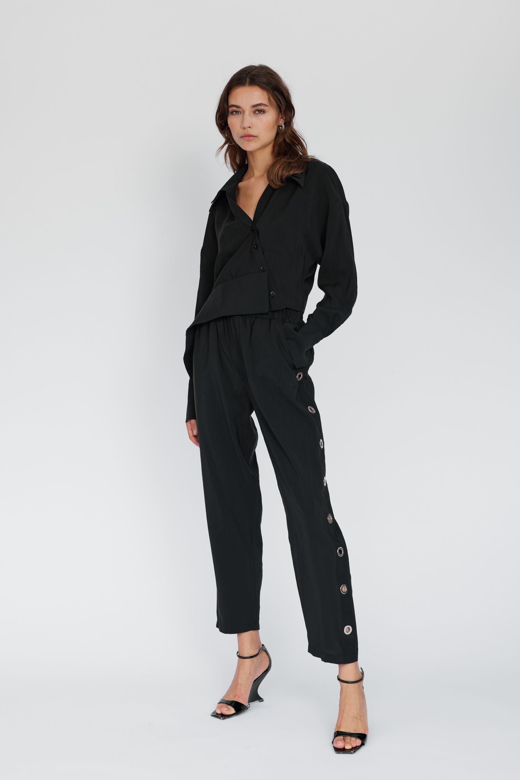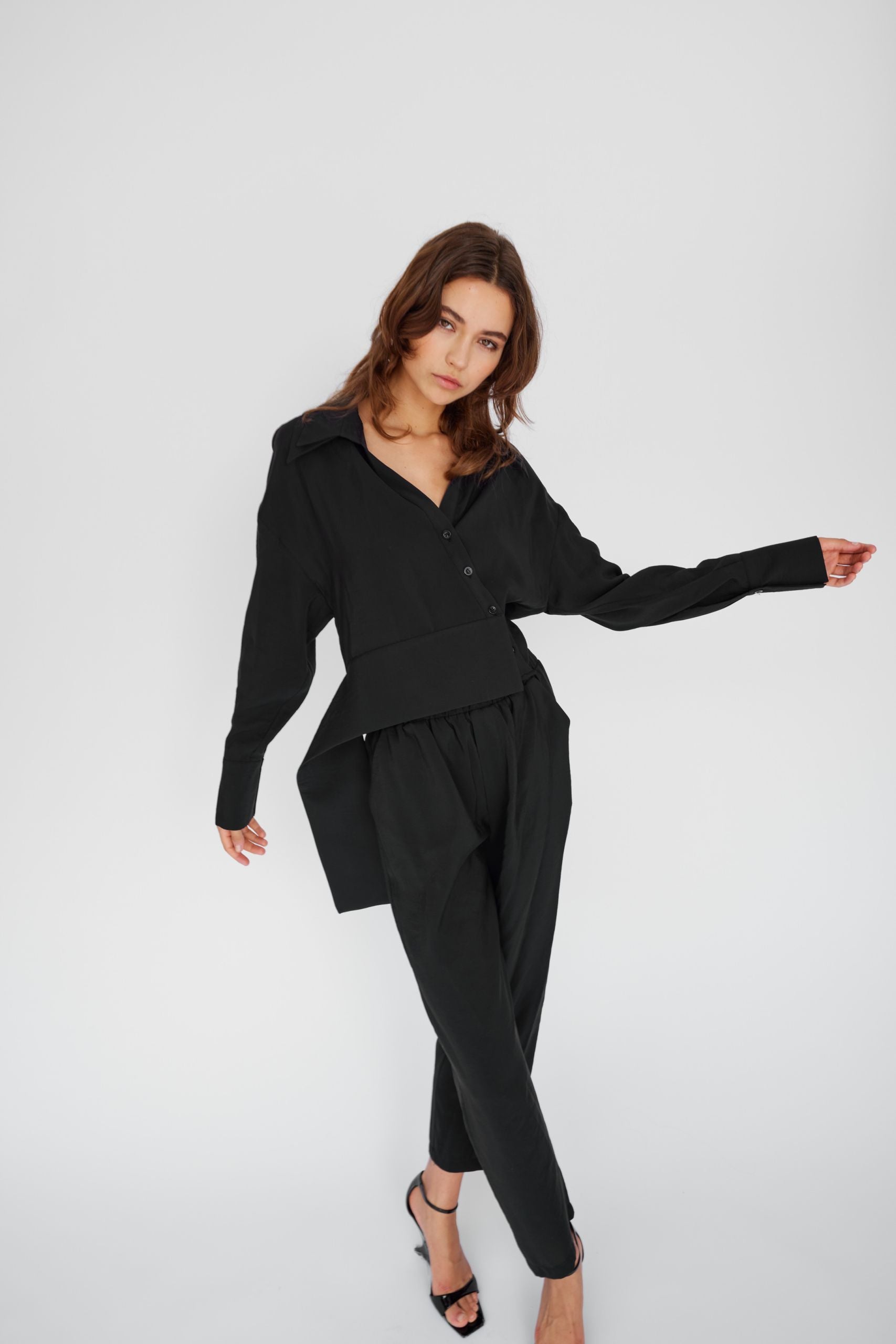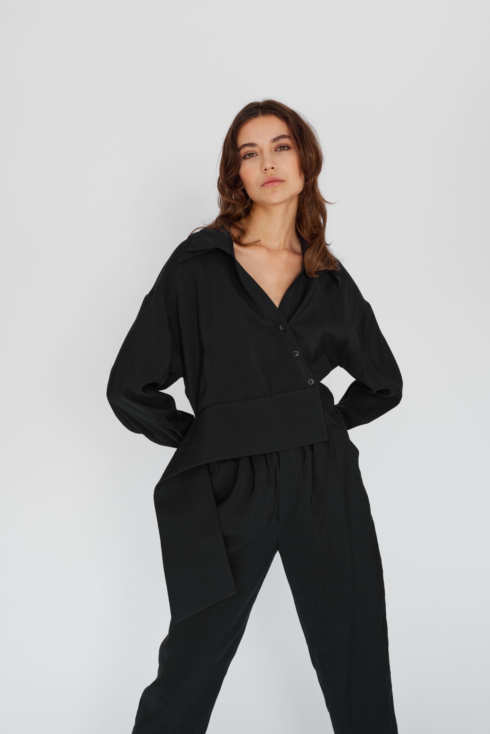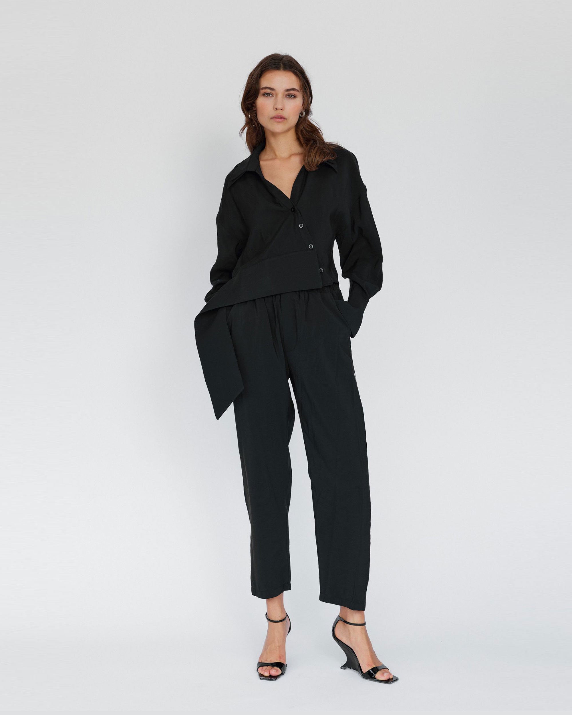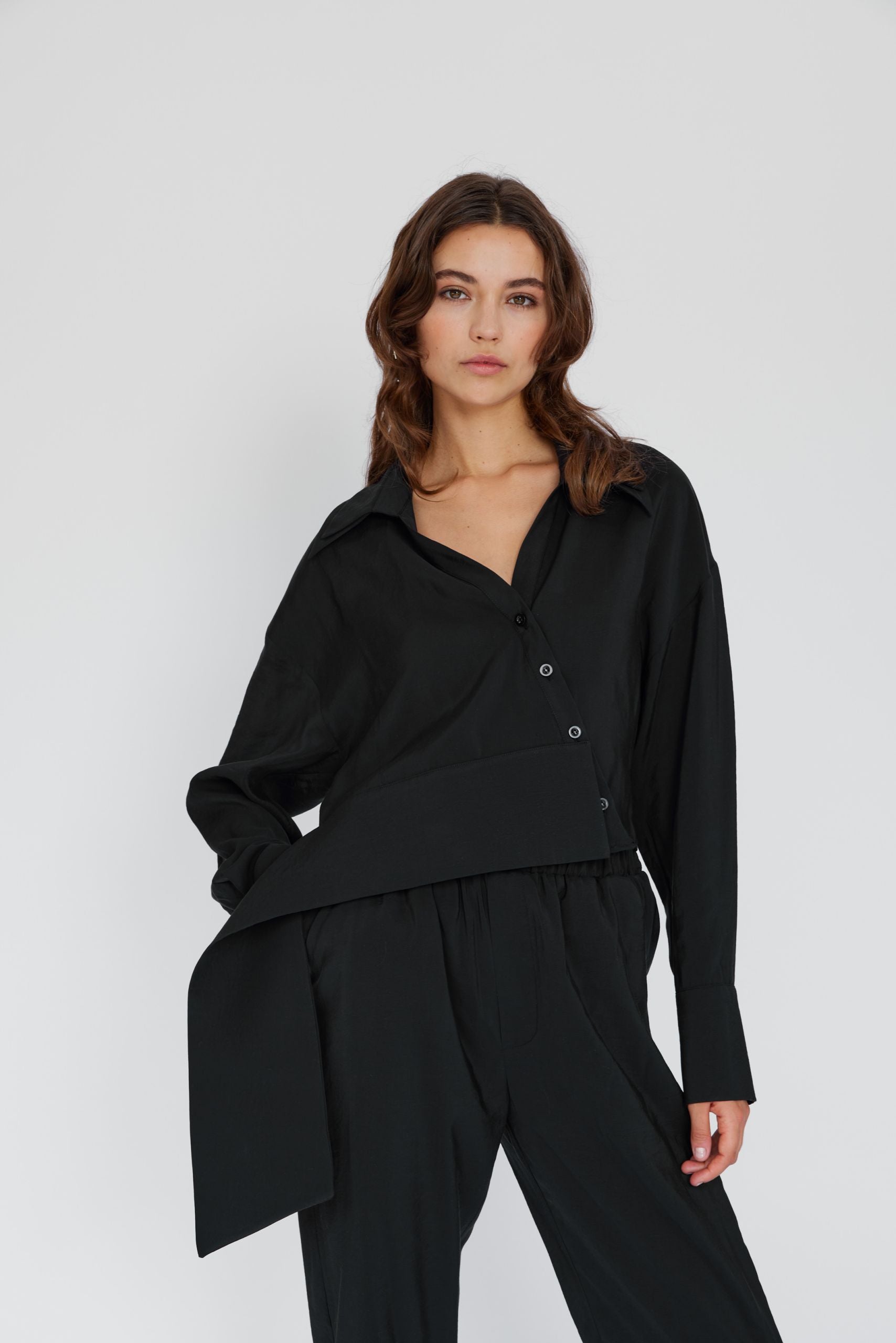 This black shirt is made from 100% cupro in a wrap-effect design with a fitted hem.