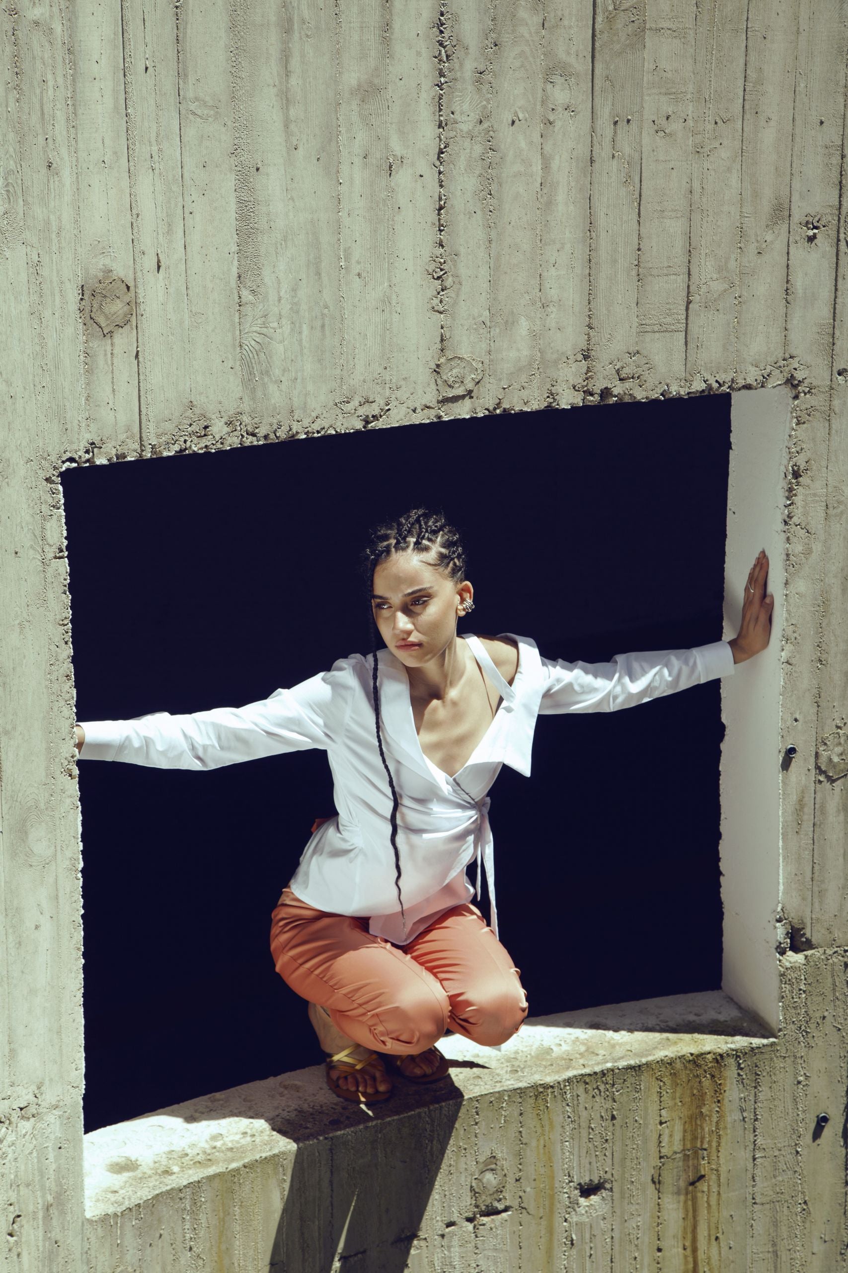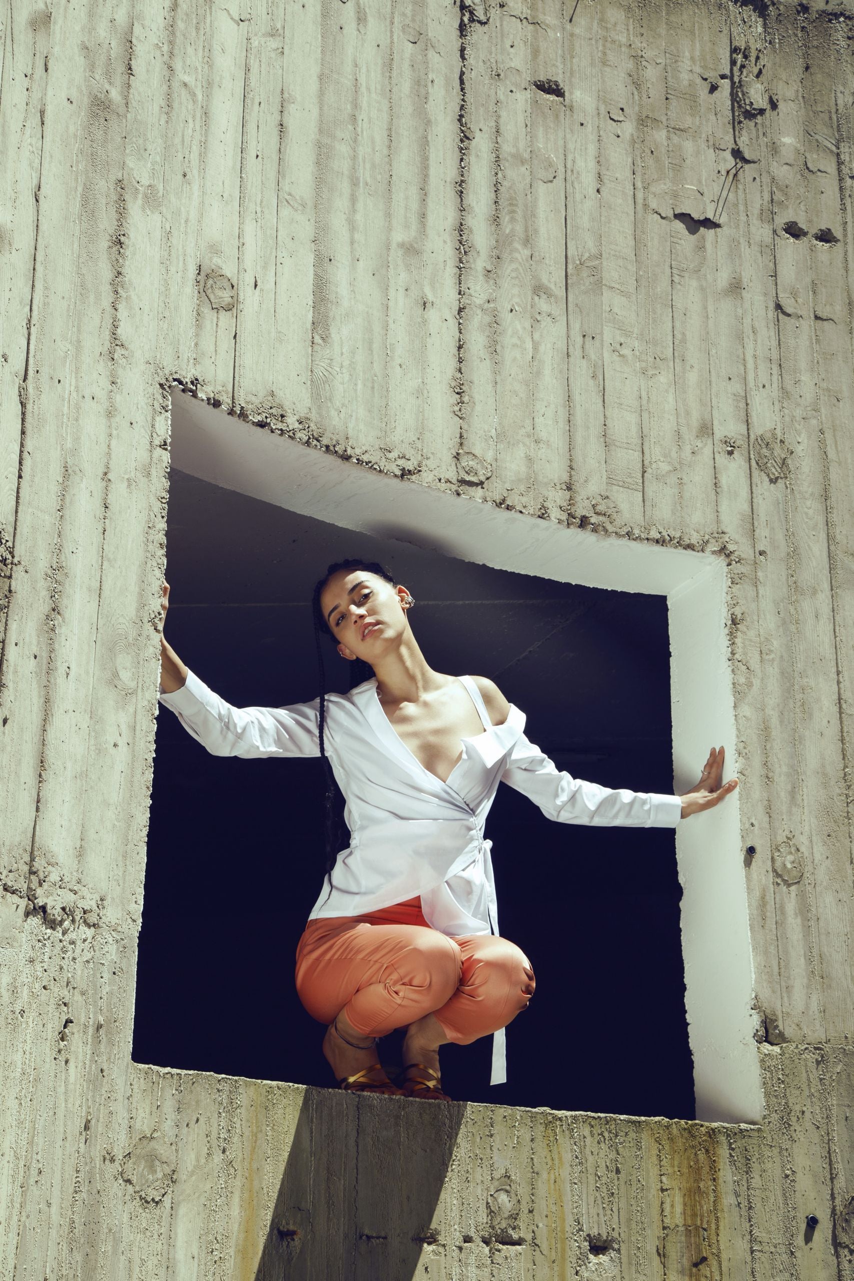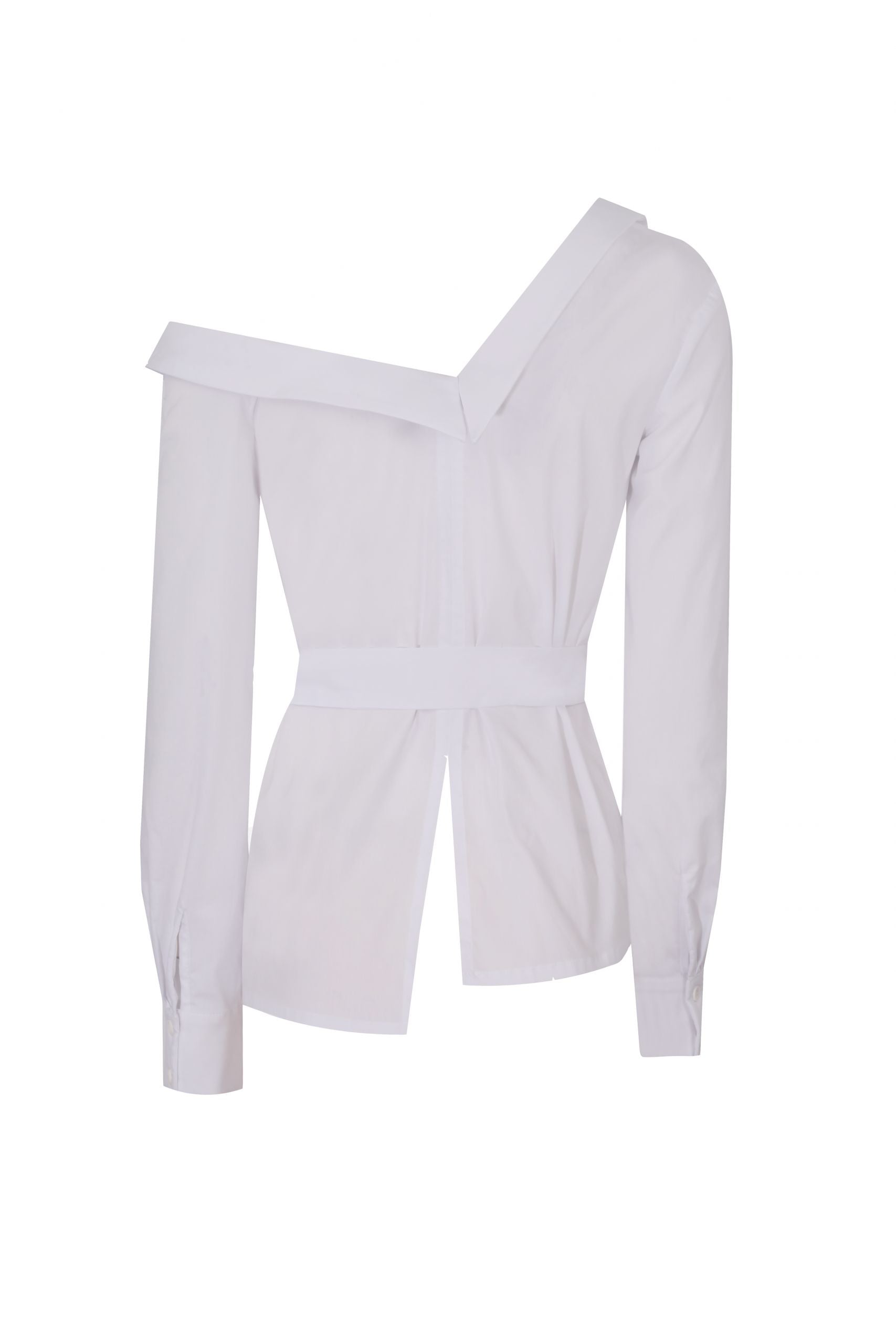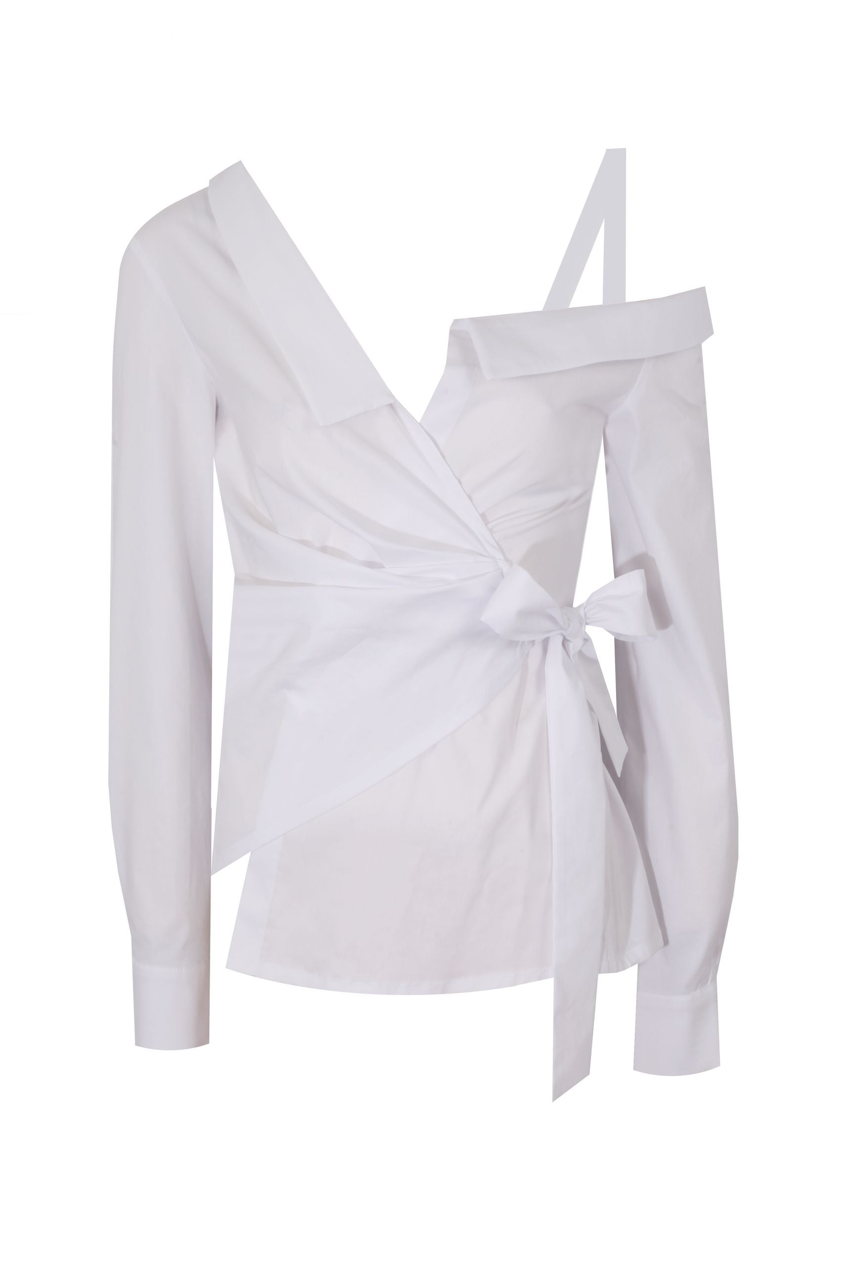 One shoulder off, wrap around white poplin shirt