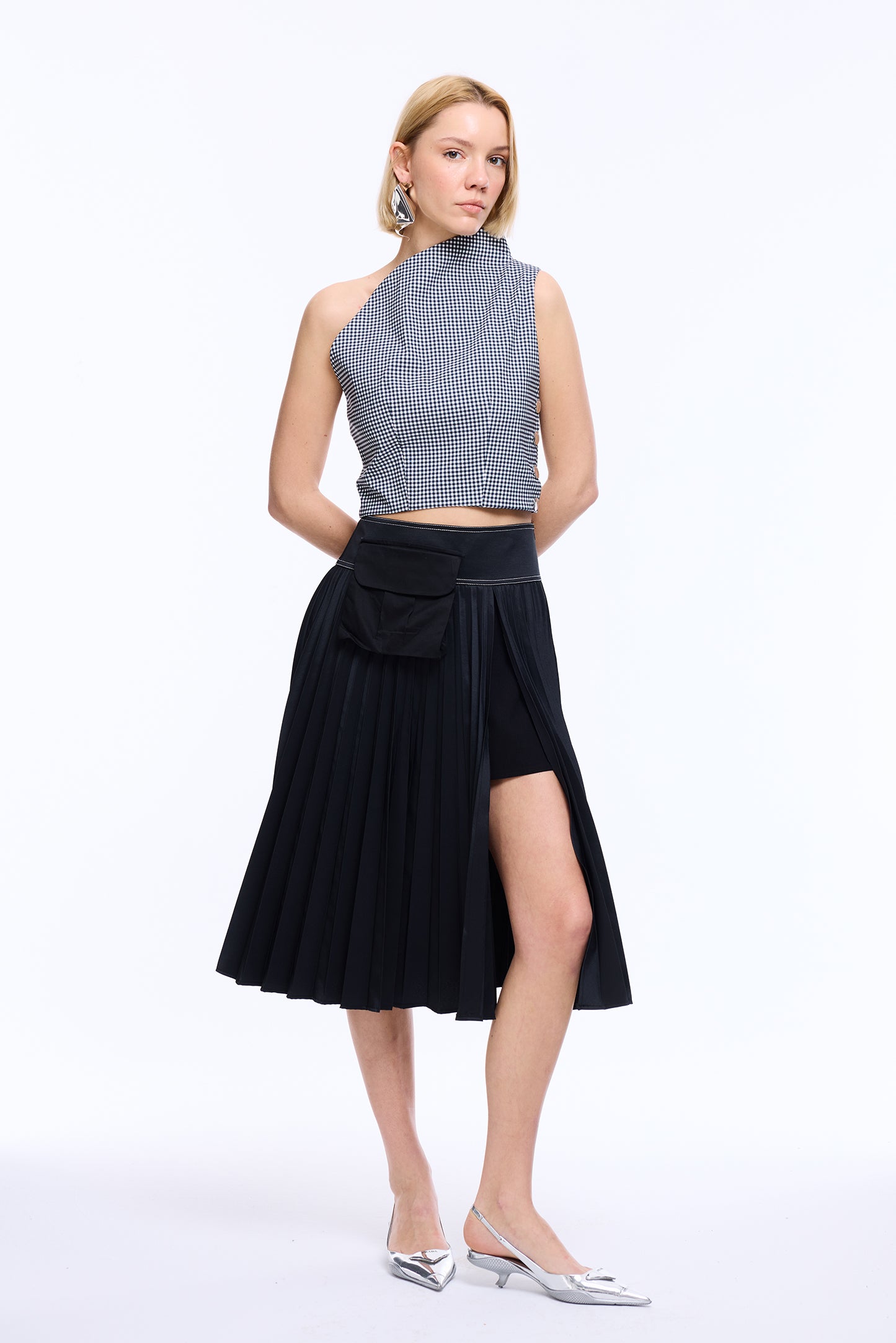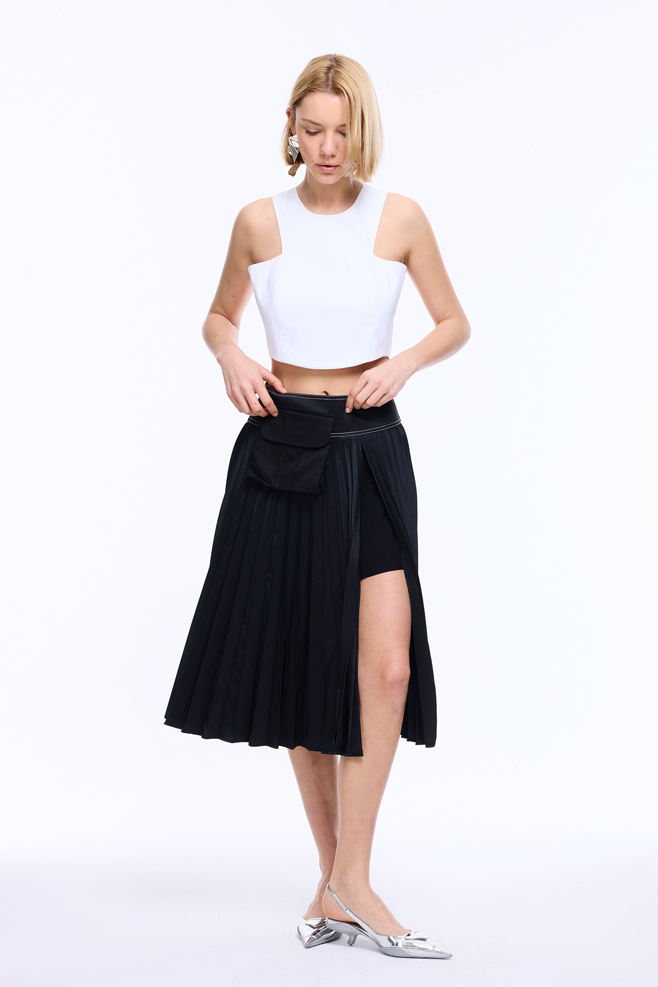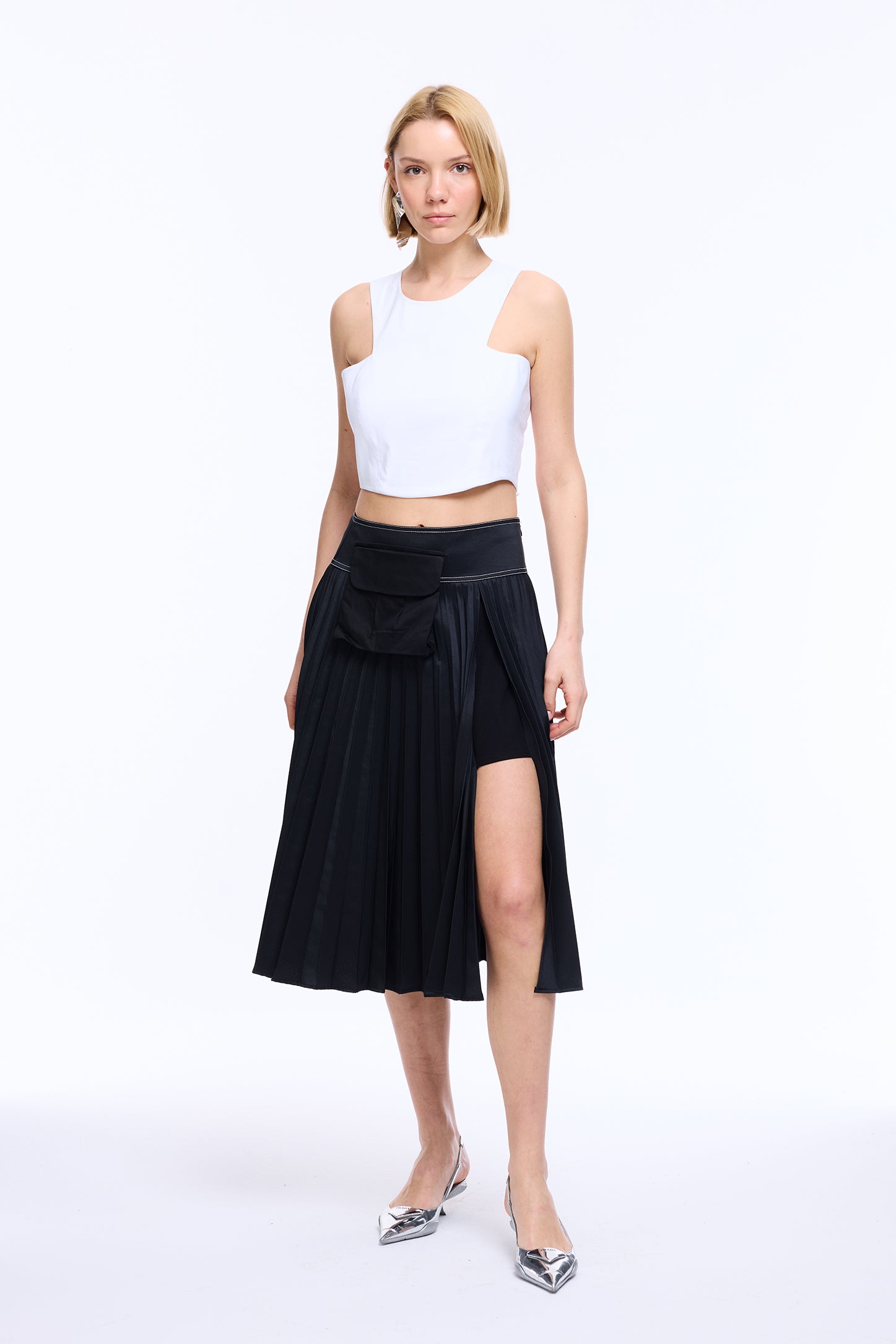 Its standout detail is an unexpected side slit, revealing a built-in mini skirt for a layered illusion.