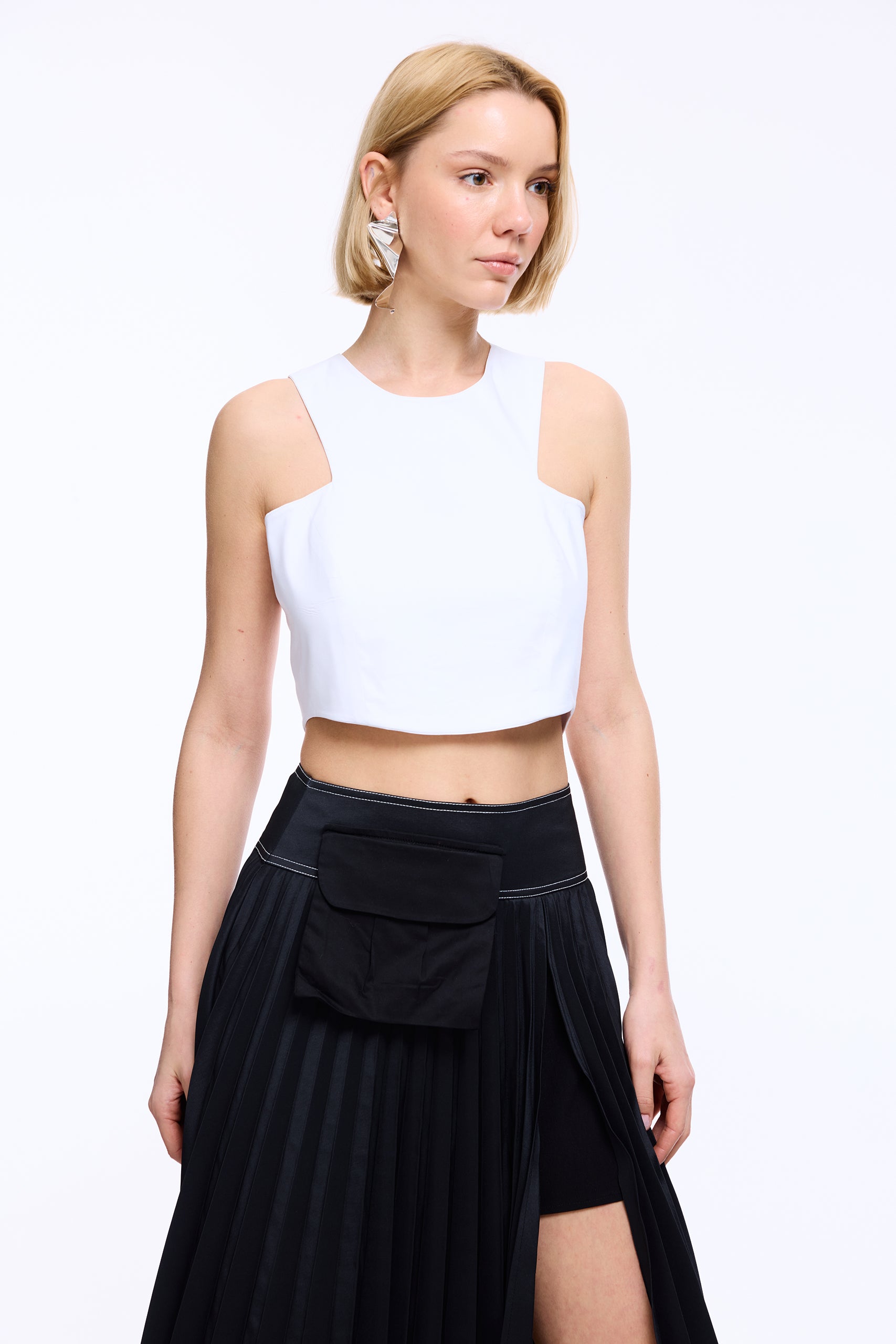 A belt-inspired panel cinches the waist, accented with contrast stitching, while a front cargo pocket adds a touch of utility.