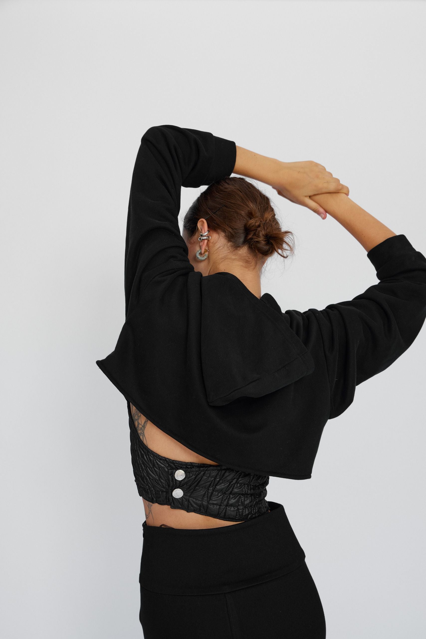 Oversize crop hoodie is elevated with a corset-shape bustier. It enables a perfect balance between femininity and sporty-comfort. It's cropped to hit the narrowest part of your waist, so it'll nicely complement high-rise pants or skirts.