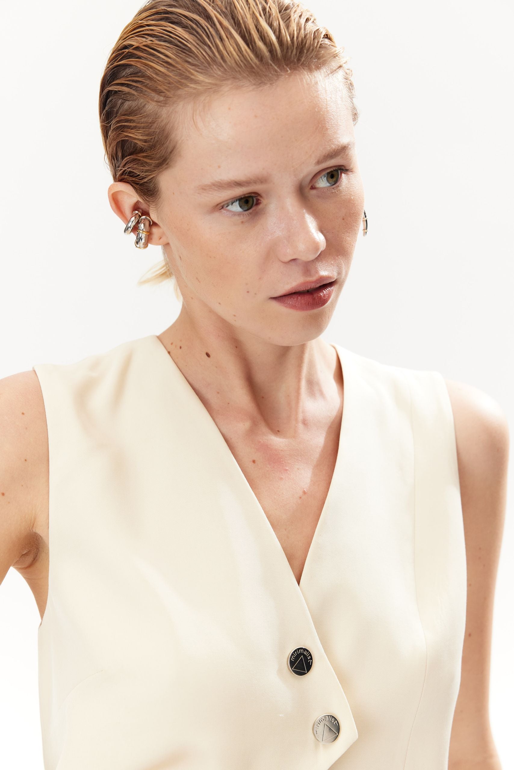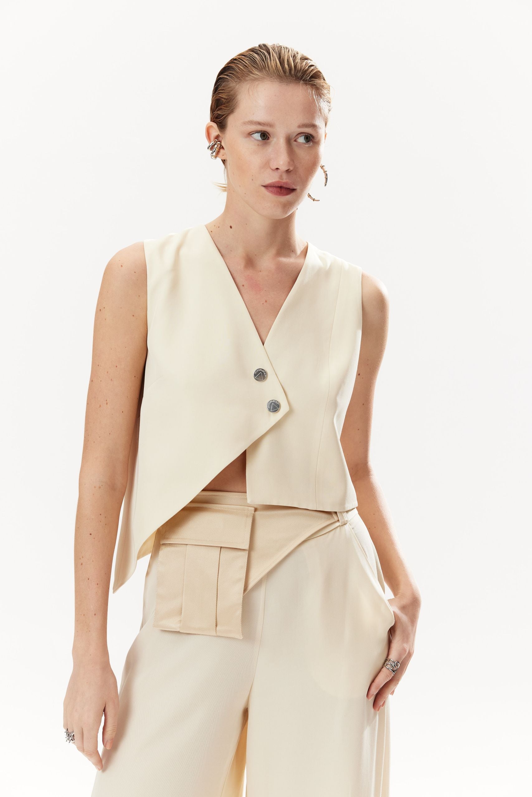 An assymmetrical tencel vest has a signature triangle shape on one side
