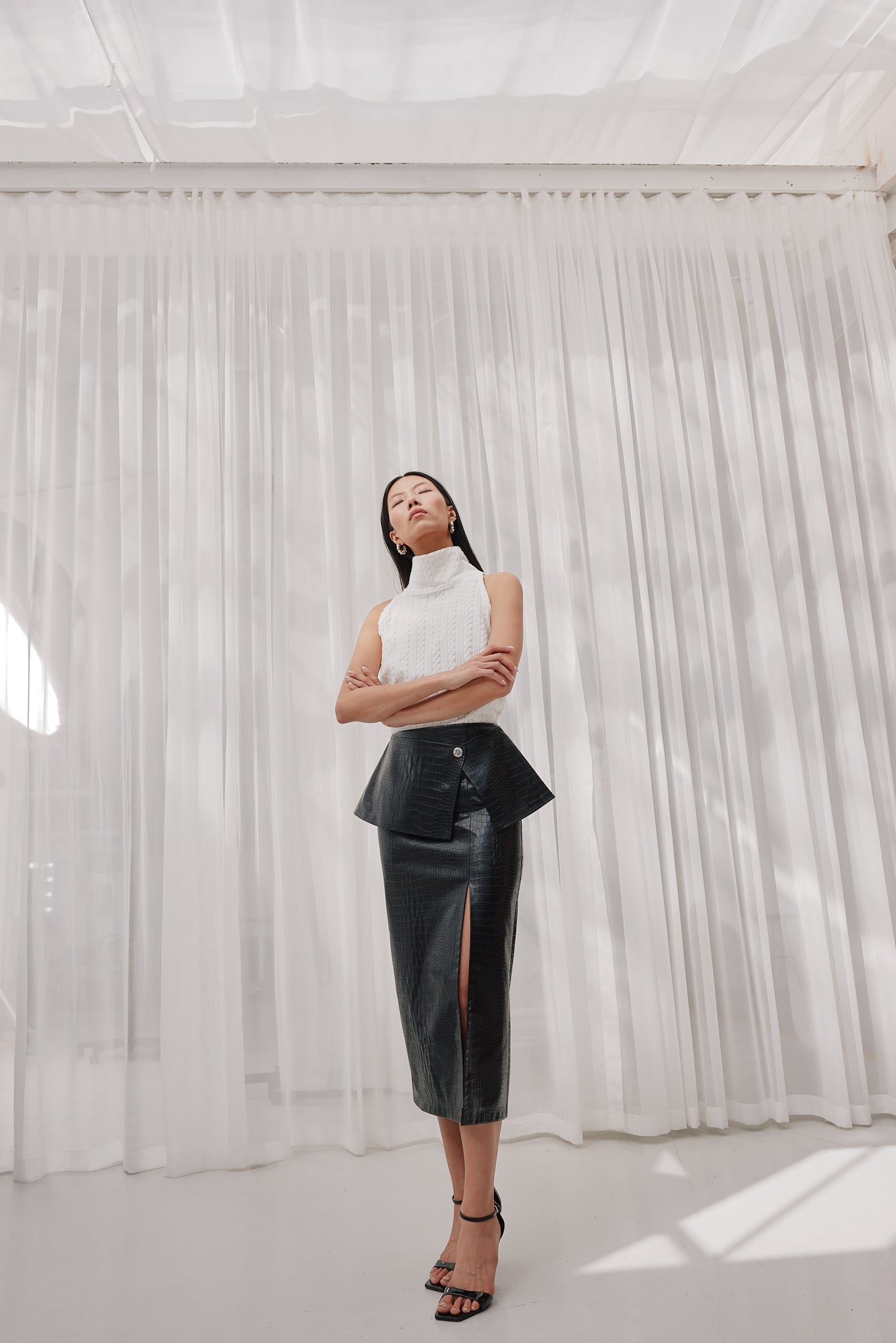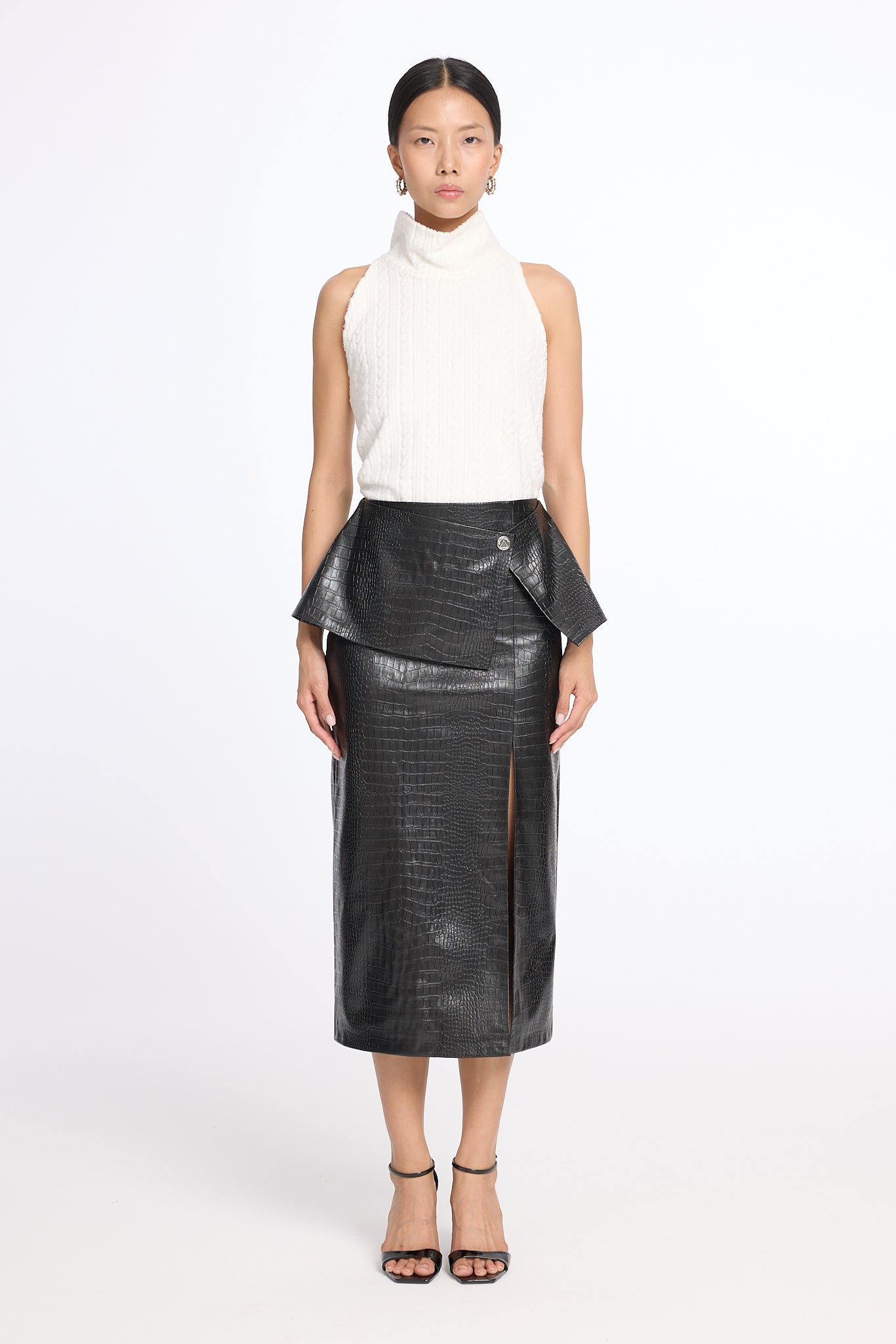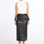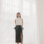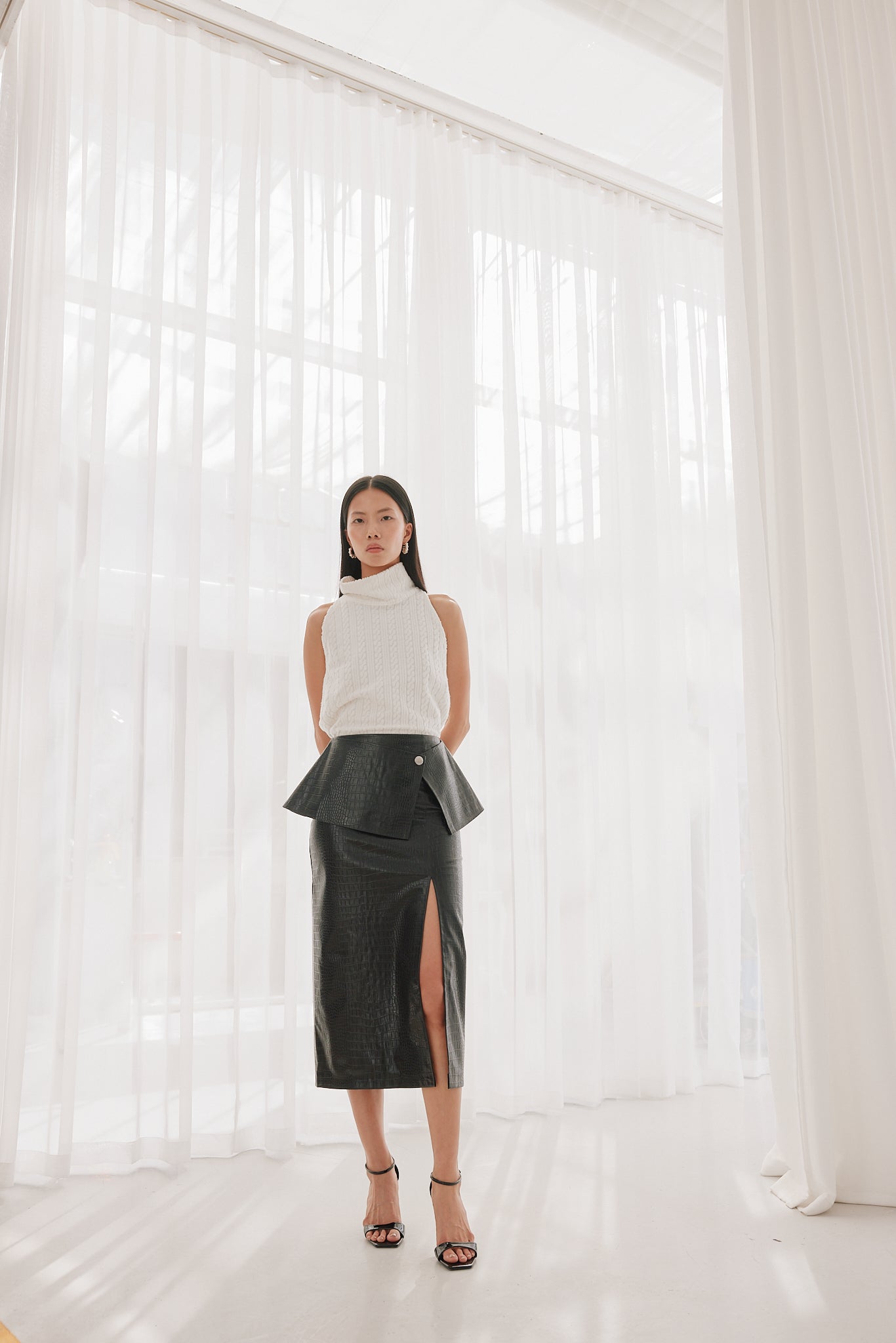 A vegan leather midi skirt with a removable peplum layer — super chic yet comfortable.