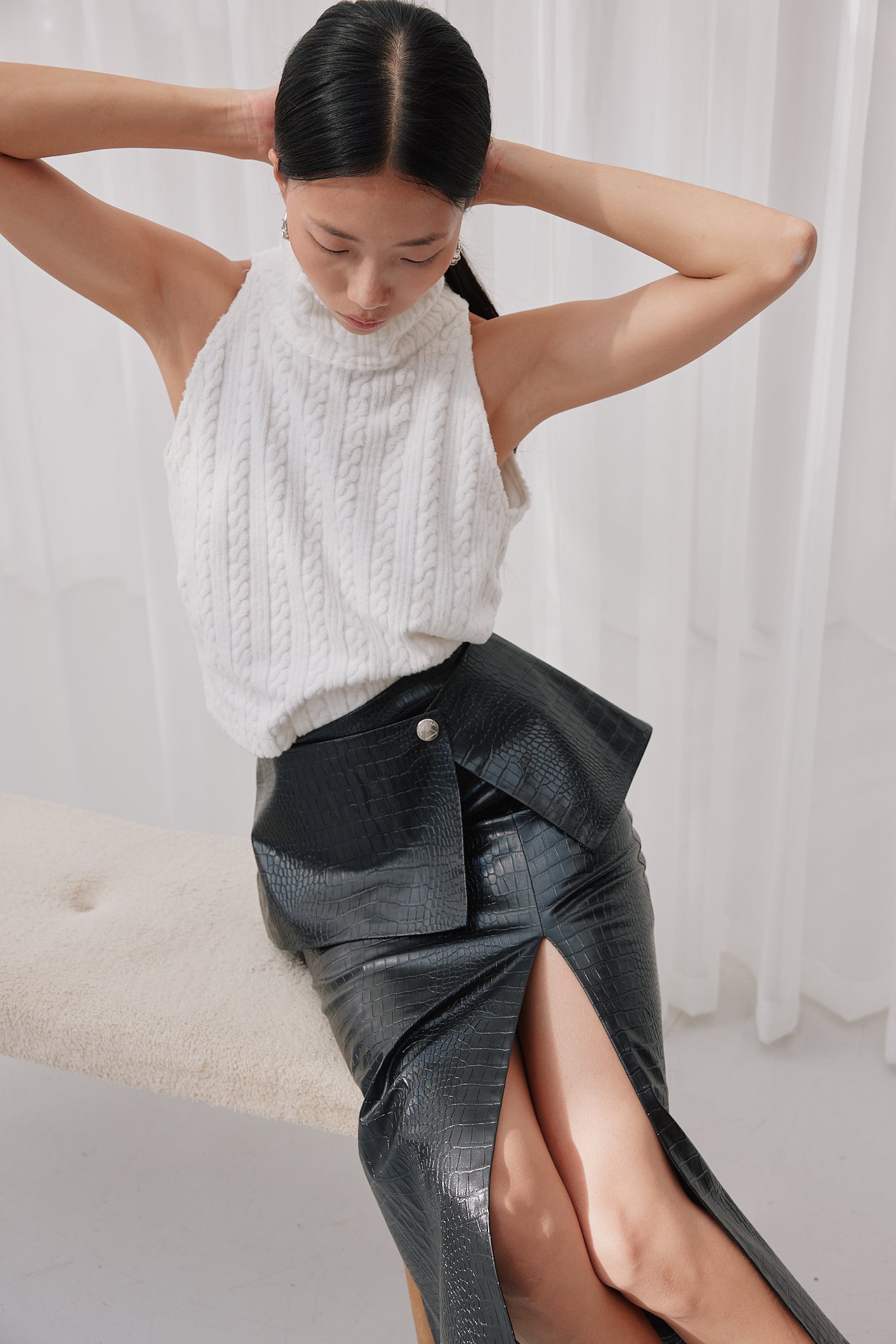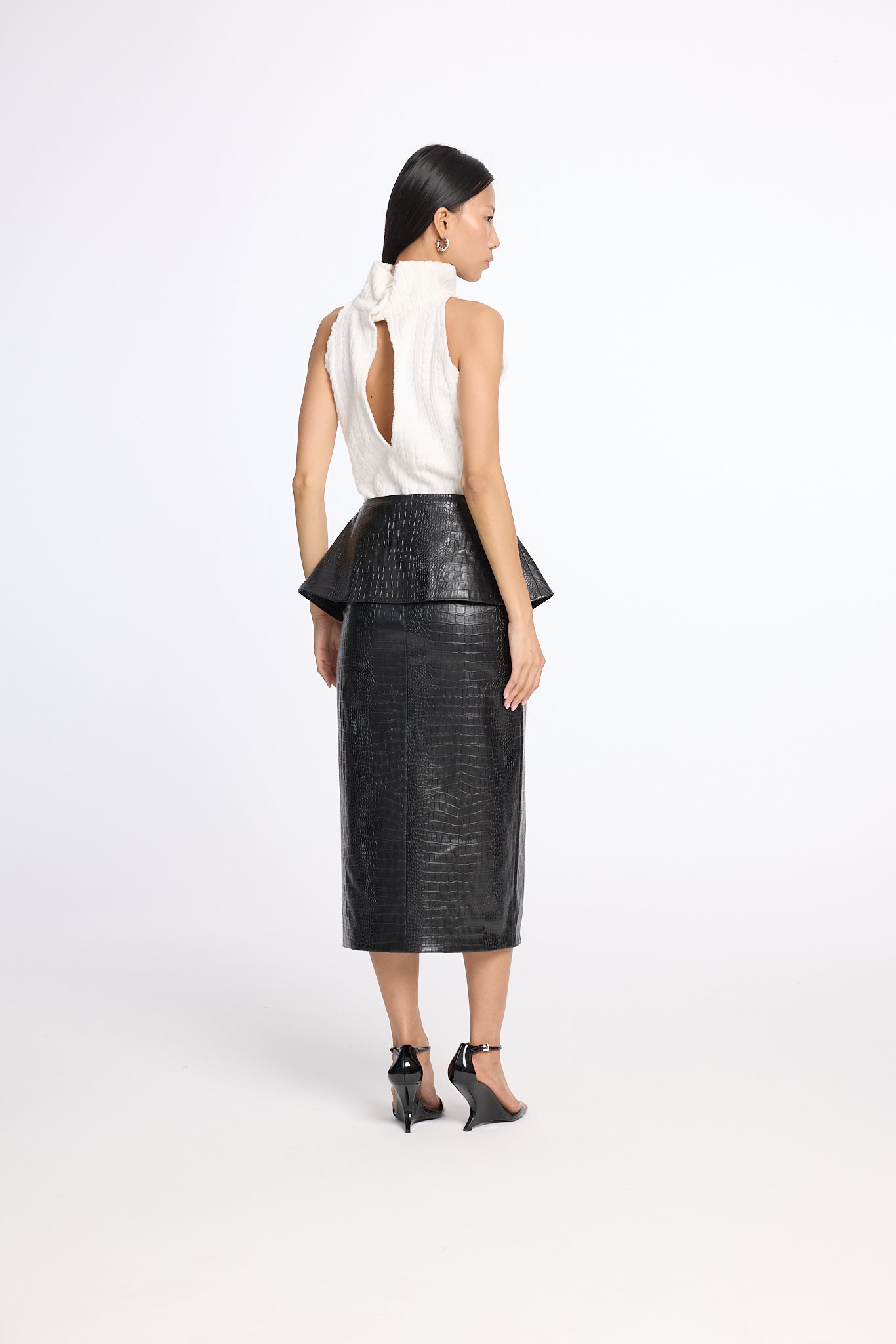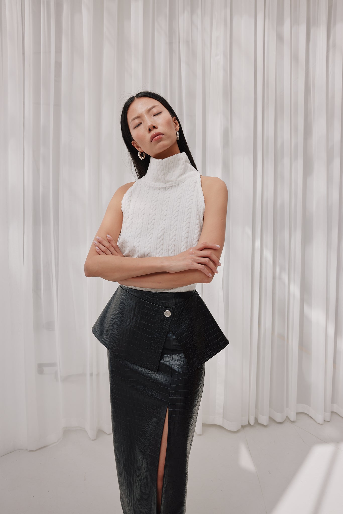 A vegan leather midi skirt with a removable peplum layer — super chic yet comfortable.