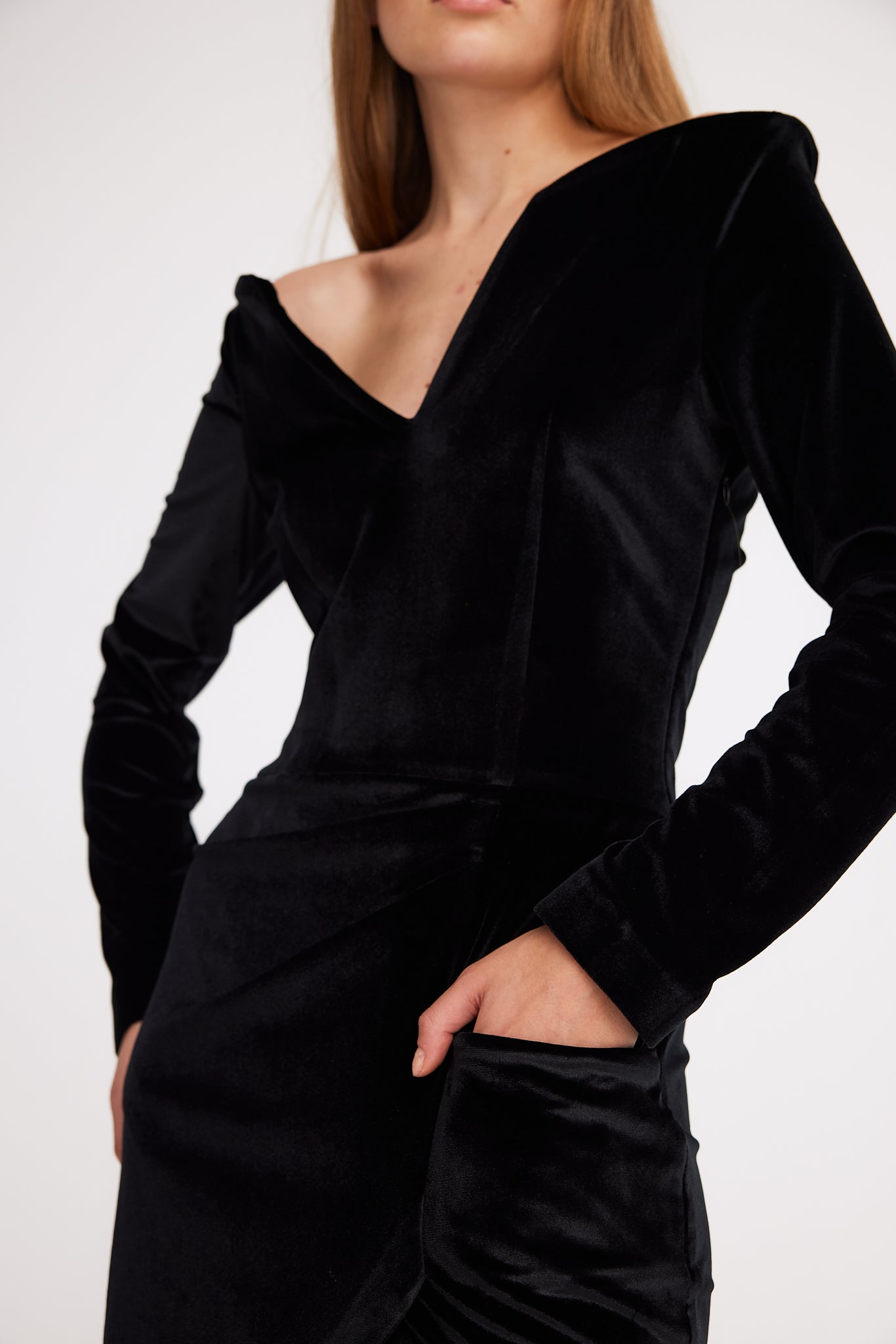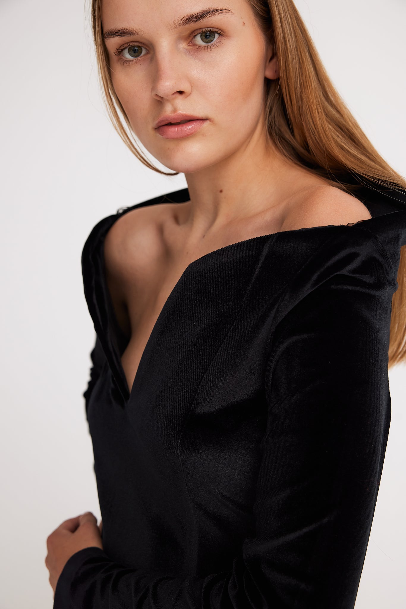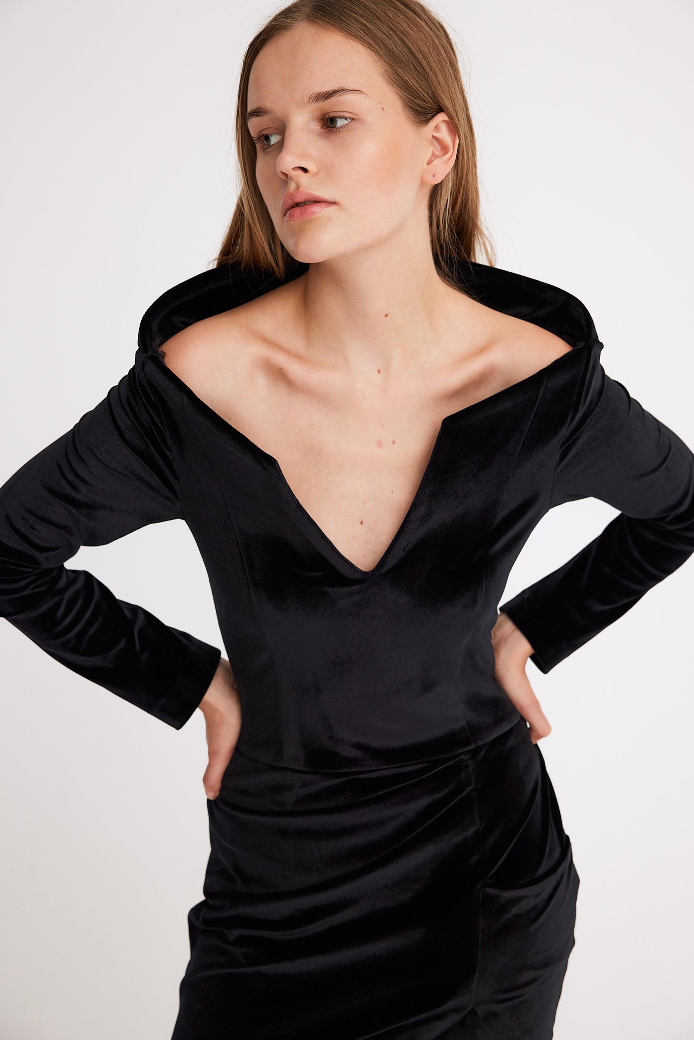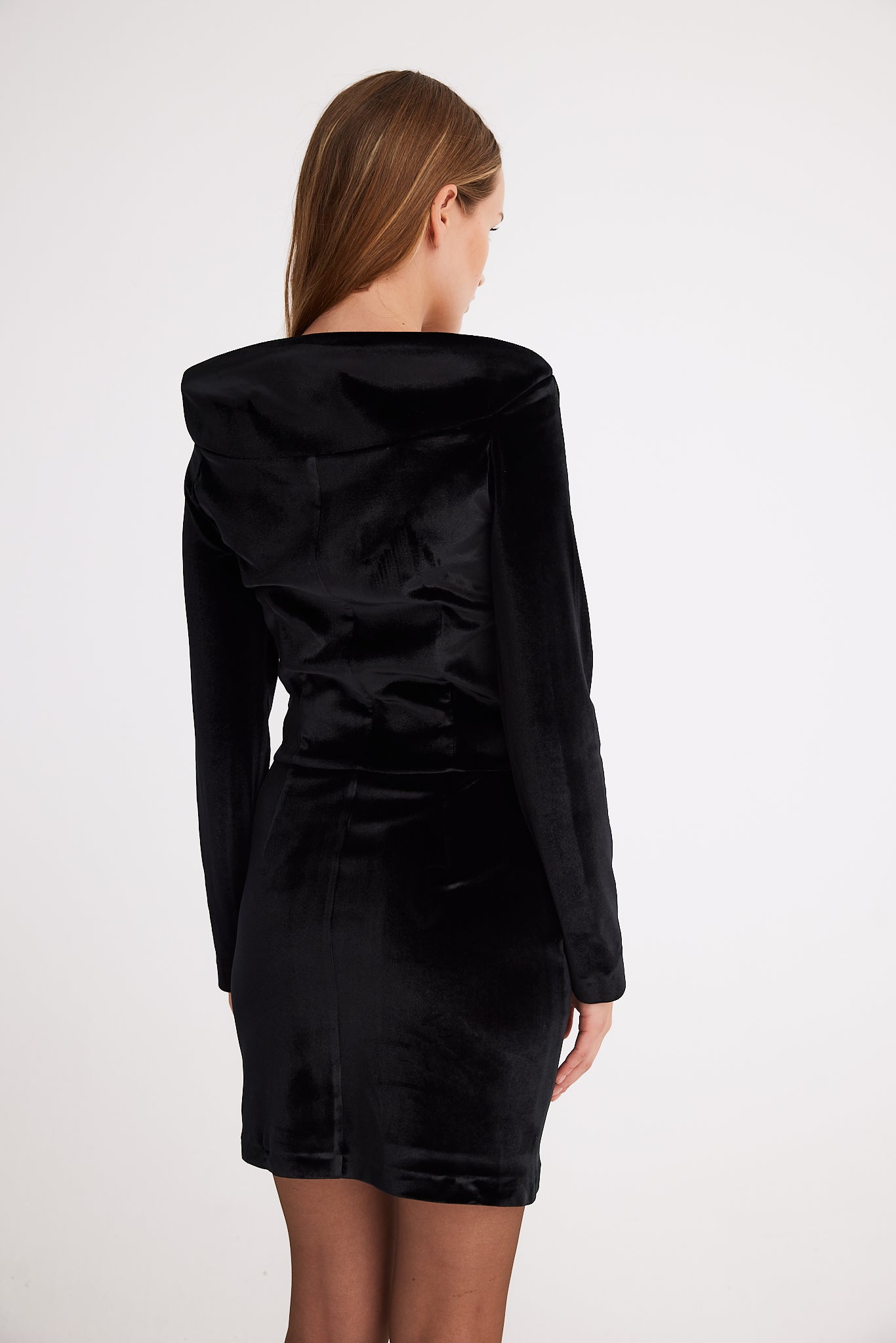 Its standout feature is the striking collar, while the elastic velvet fabric gently hugs your silhouette, creating a flattering and elegant look.