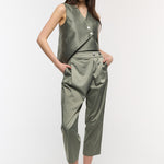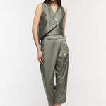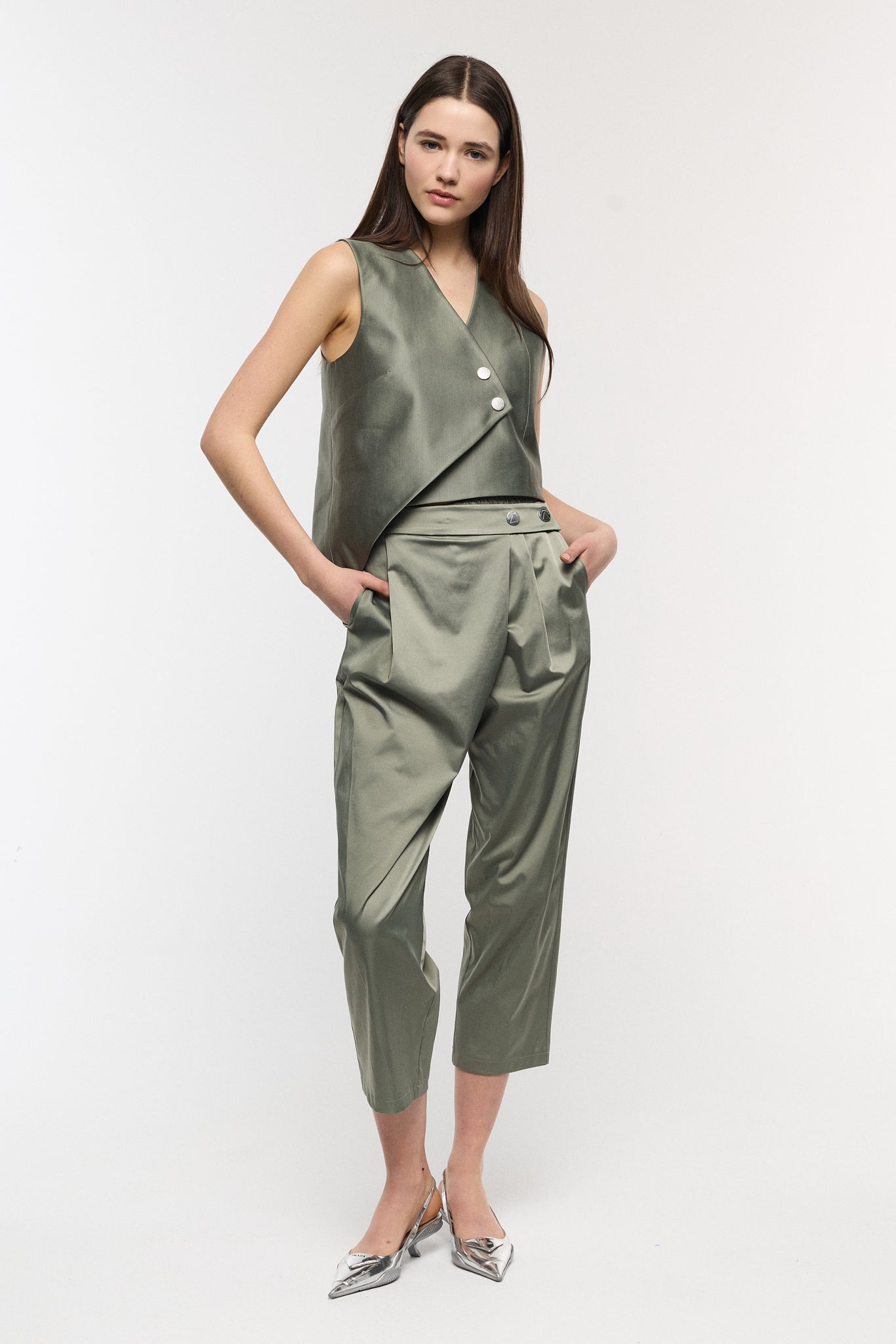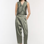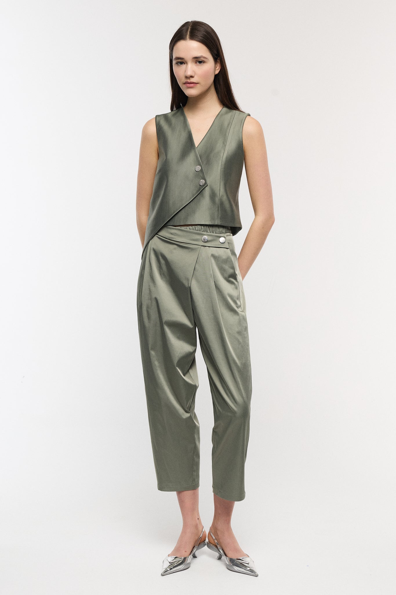 Straight carrot fit pants are elevated via cross close detail on front