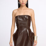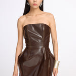 Crafted from dark brown vegan leather, its strapless neckline completes a look that is both chic and effortlessly cool.