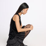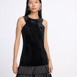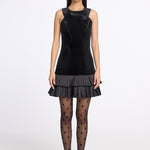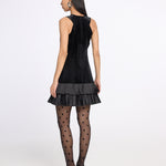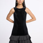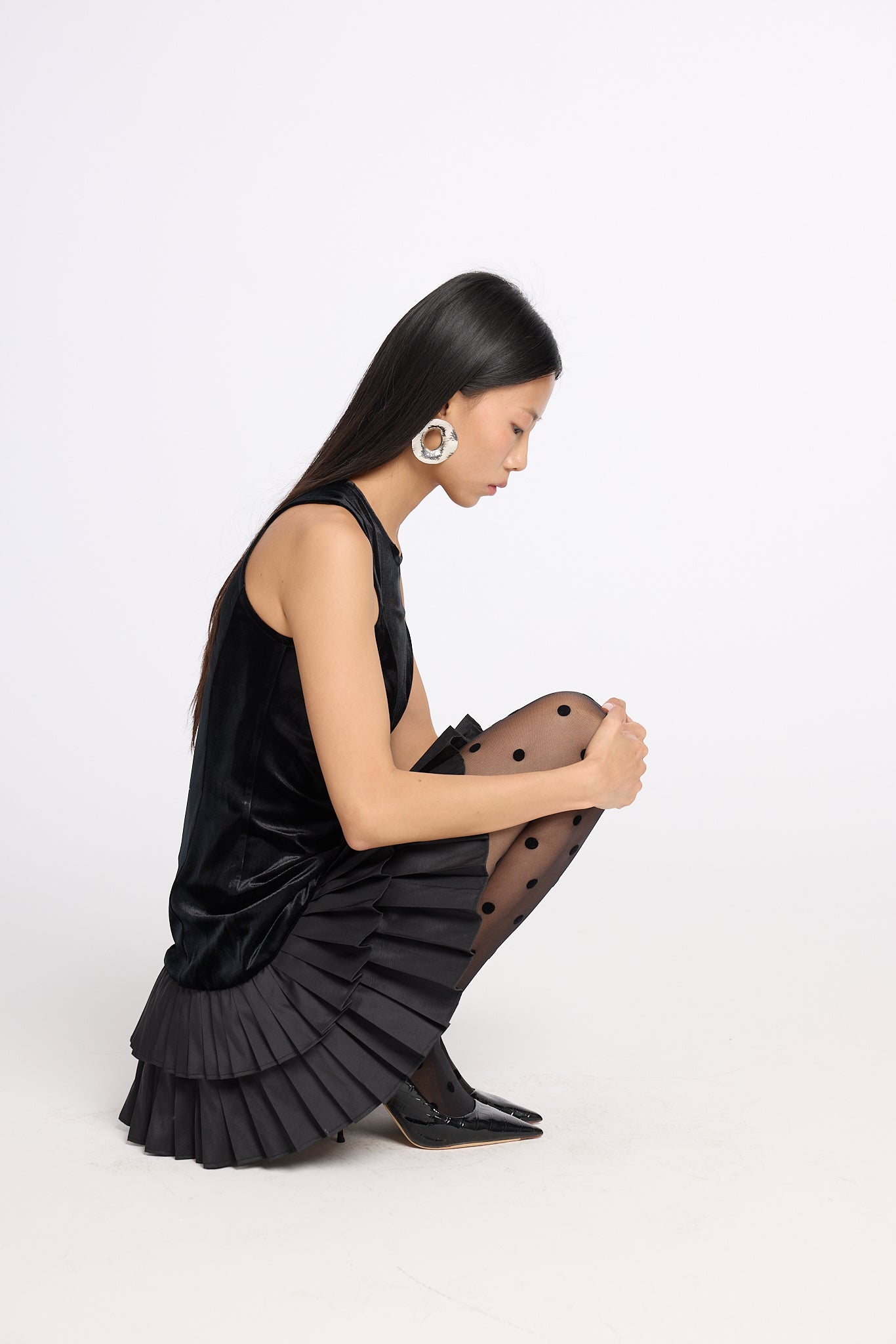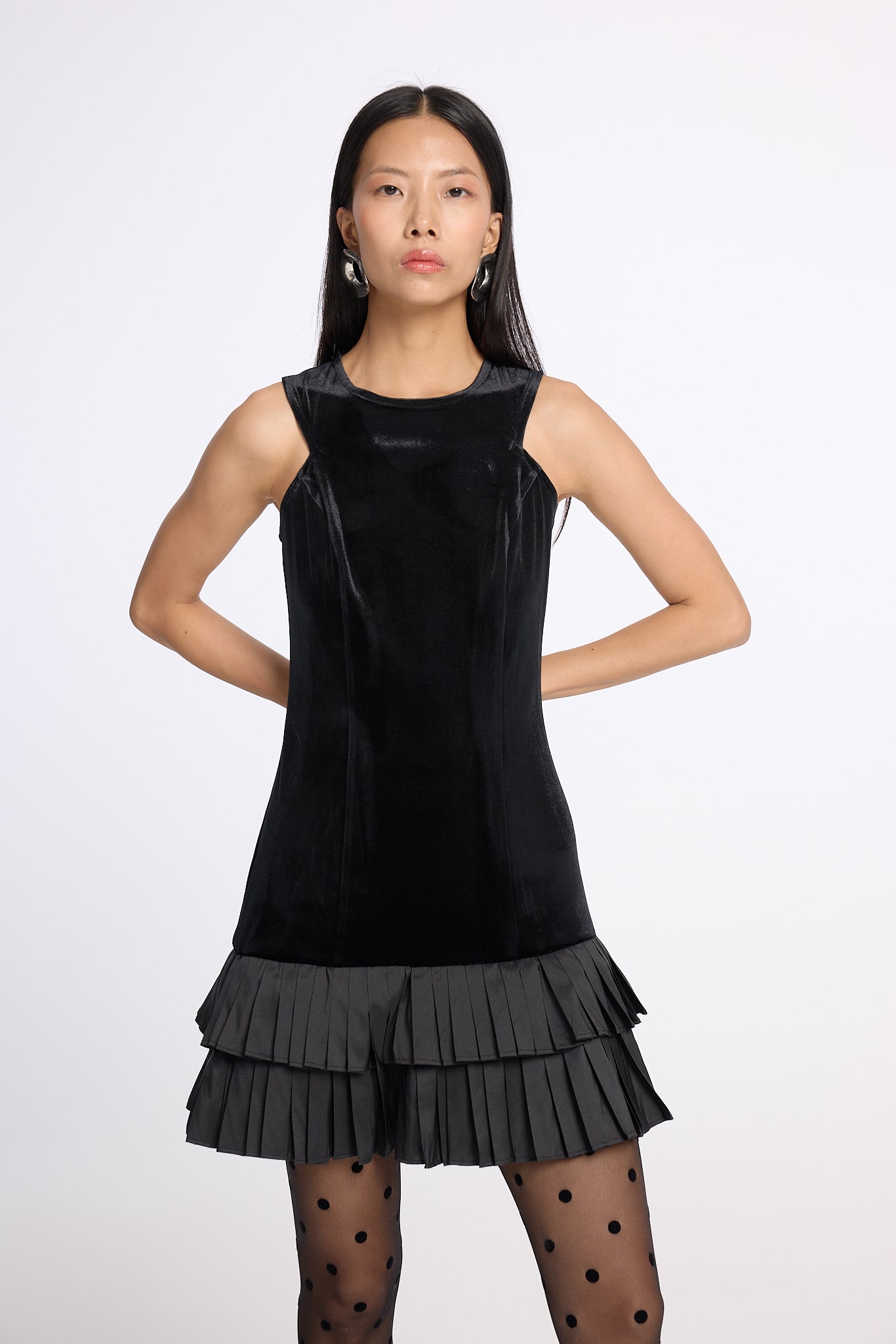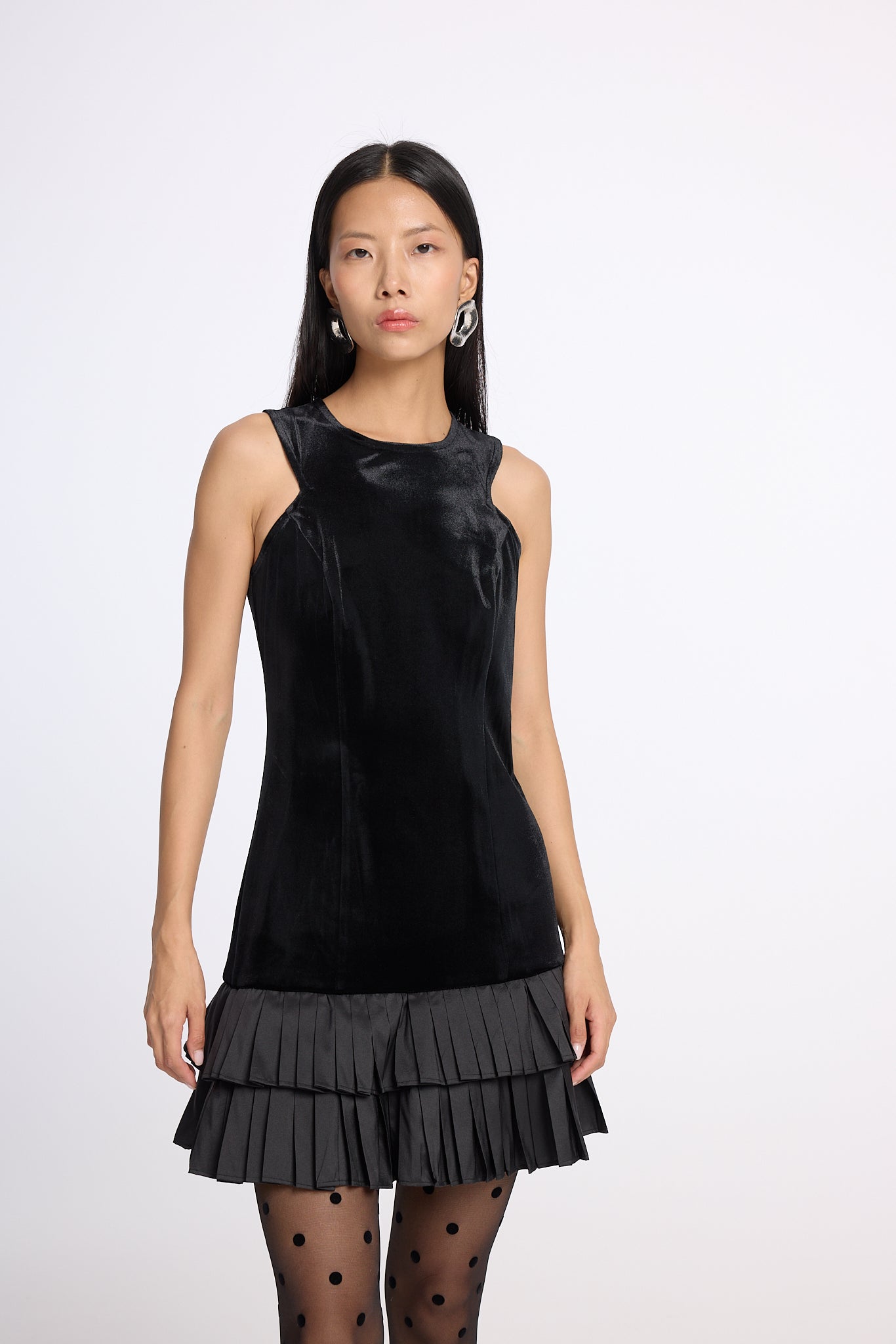 This charming black mini dress features a halter neckline that lends a sportif edge. Crafted from soft velvet, it hugs the body with a comfortable, elastic fit and falls to a playful pleated mini hem — effortlessly combining comfort and cuteness.